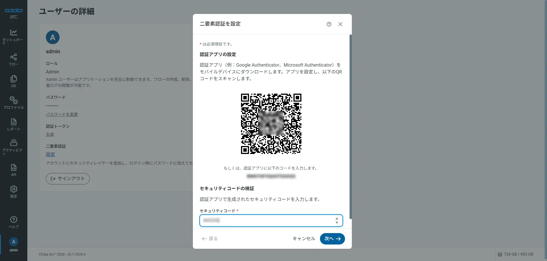 アカウントが確認されると「二要素認証を設定」ダイアログで、認証アプリの設定を求められます。Google Authenticator やMicrosoft Authenticator など、希望する認証アプリで表示されているQR コードをスキャンすると、CData Arc が認証アプリに追加されます。