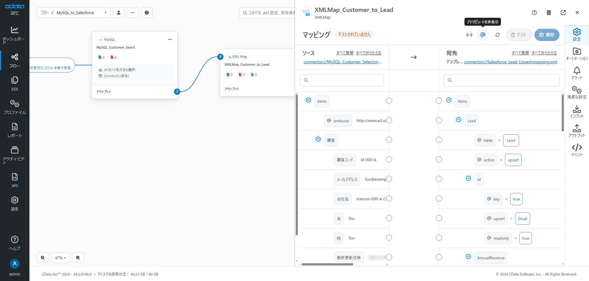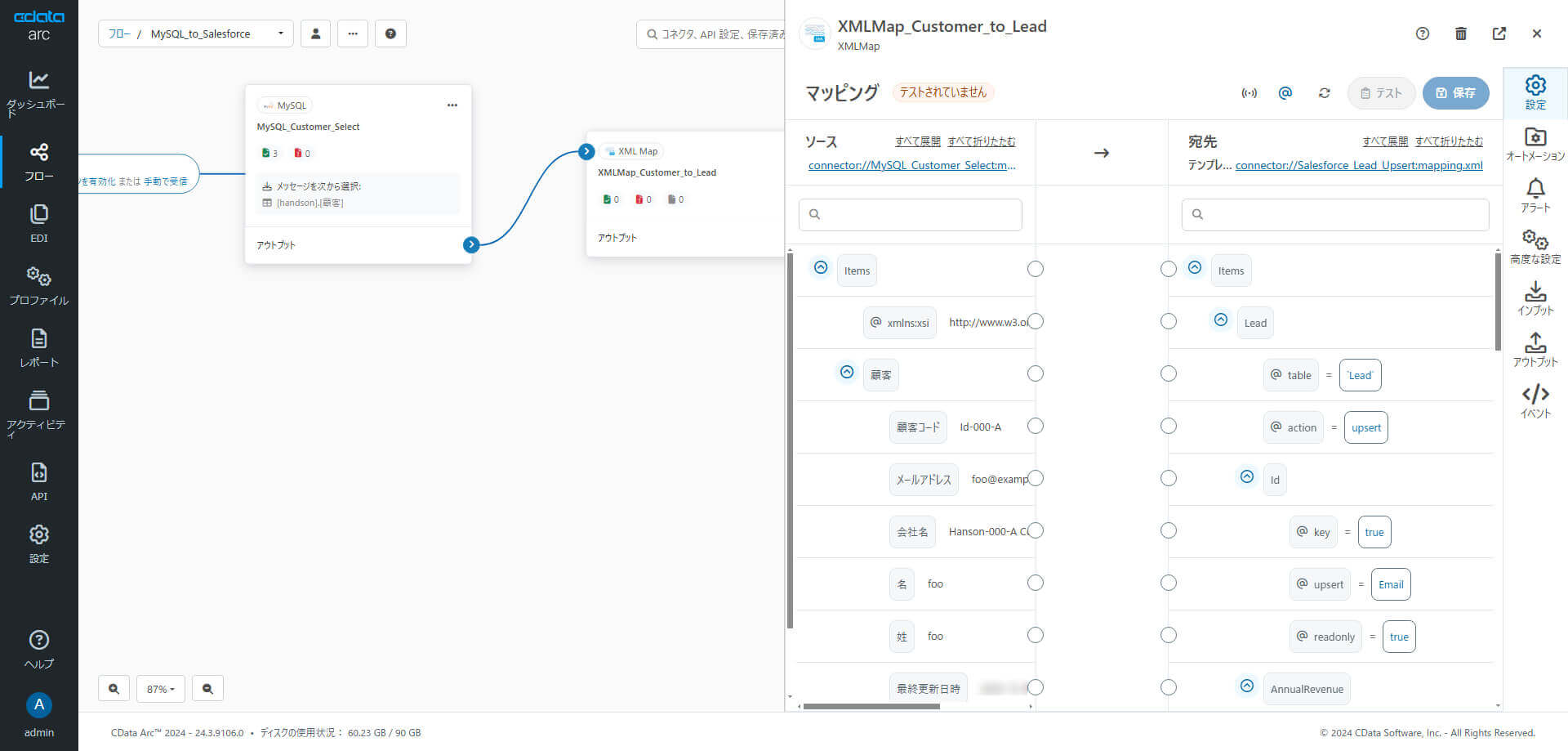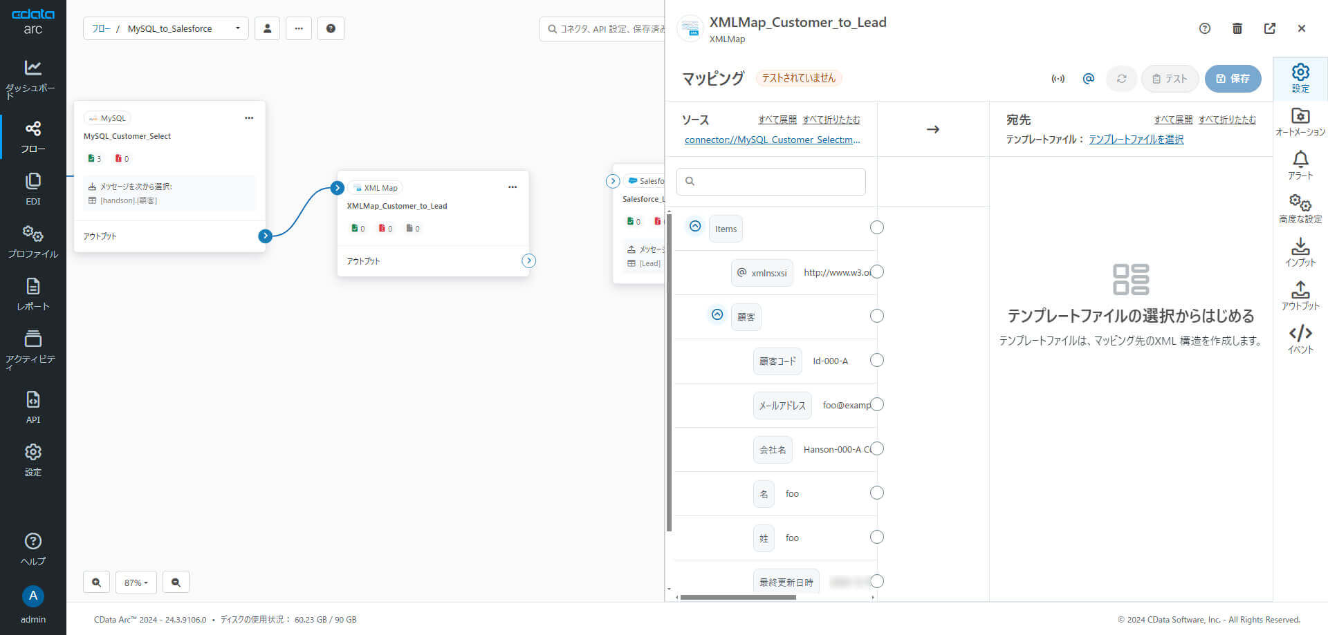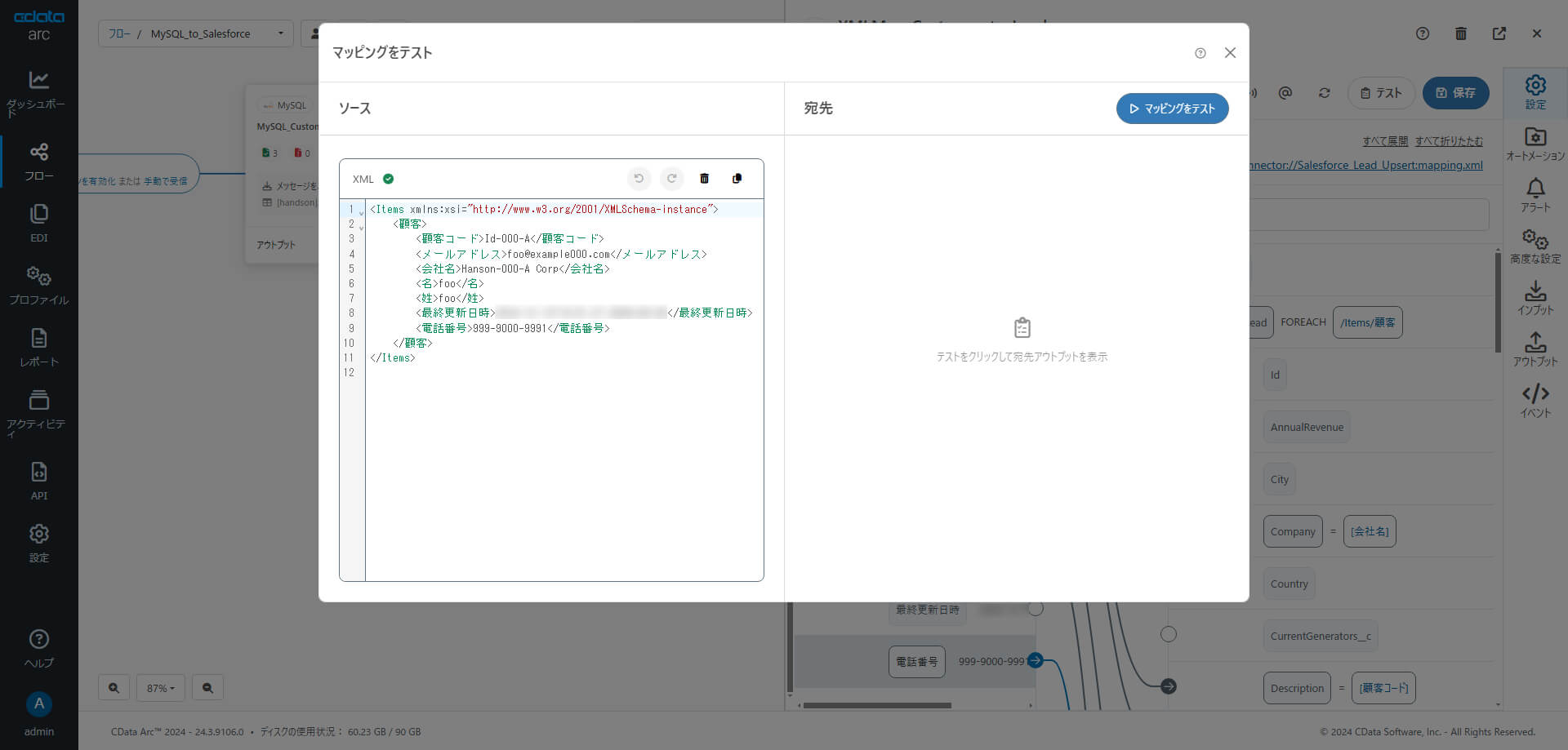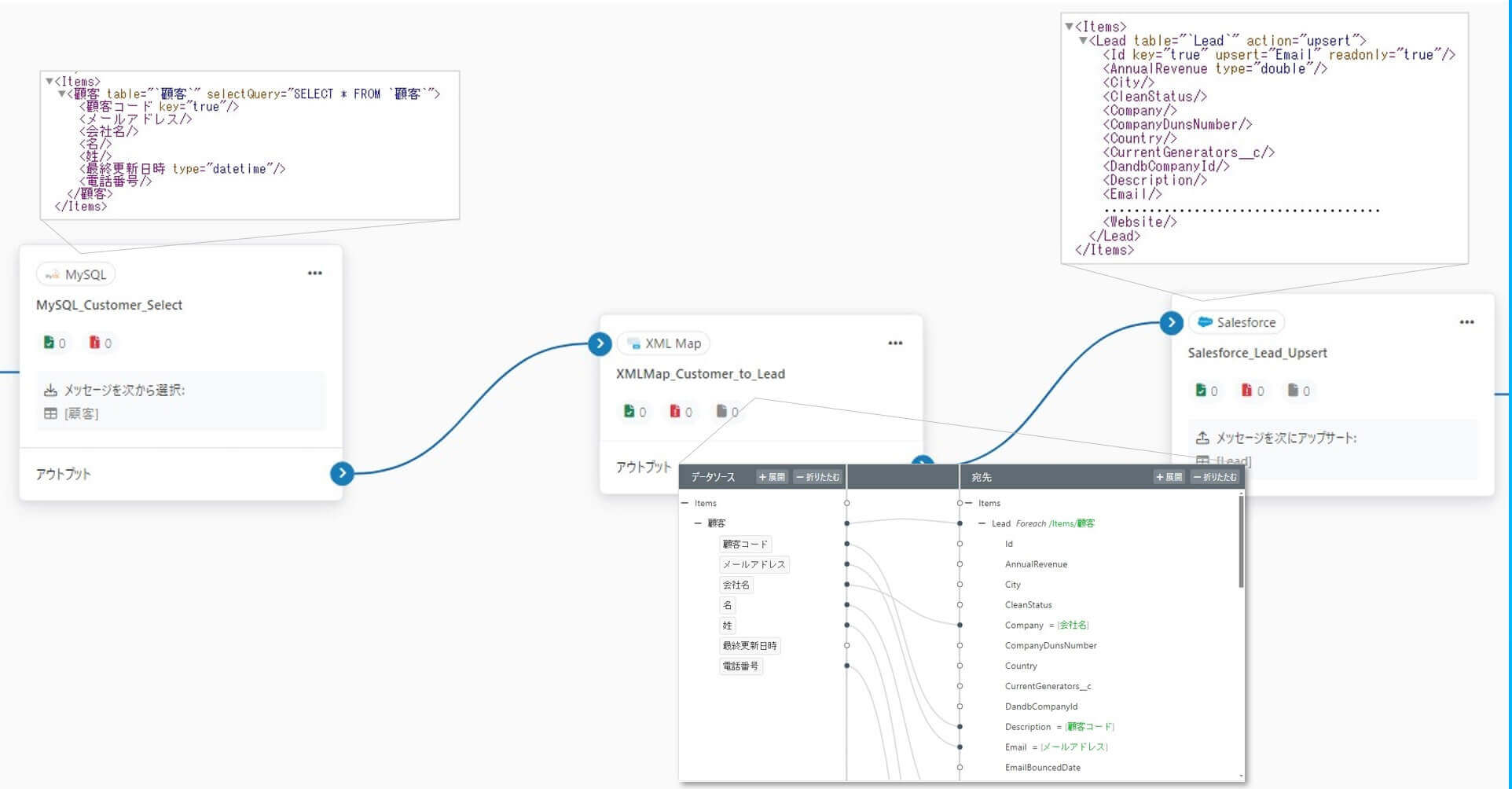 最後に「MySQL のデータをSalesforce へマッピング」するXMLMap コネクタを設定します。