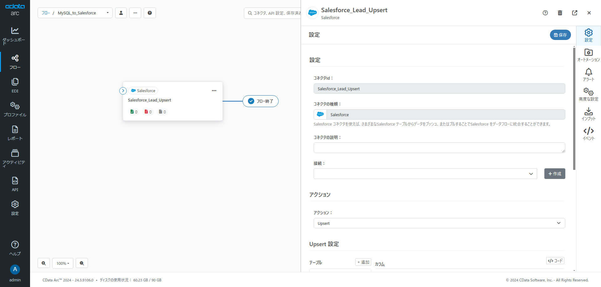 次に「Salesforce のLead オブジェクトへUpsert(データを更新)」するSalesforce コネクタを設定します。この連携フローのおわり(終点)となるコネクタです。