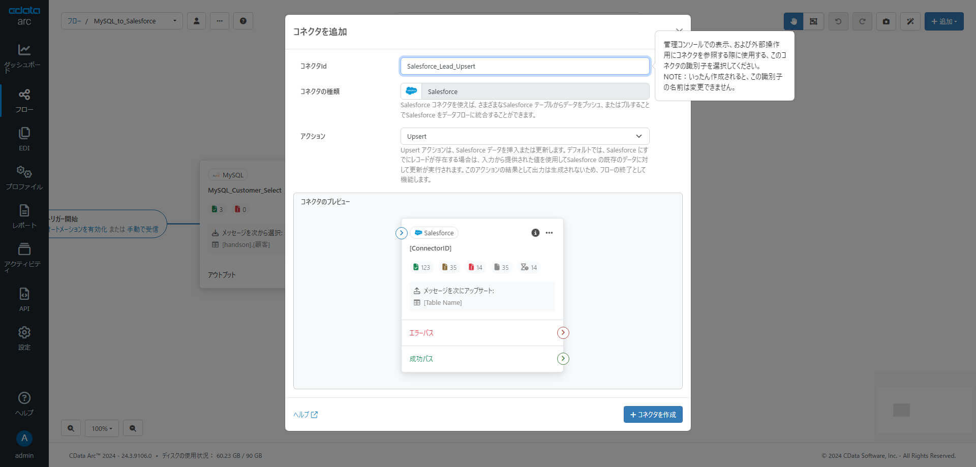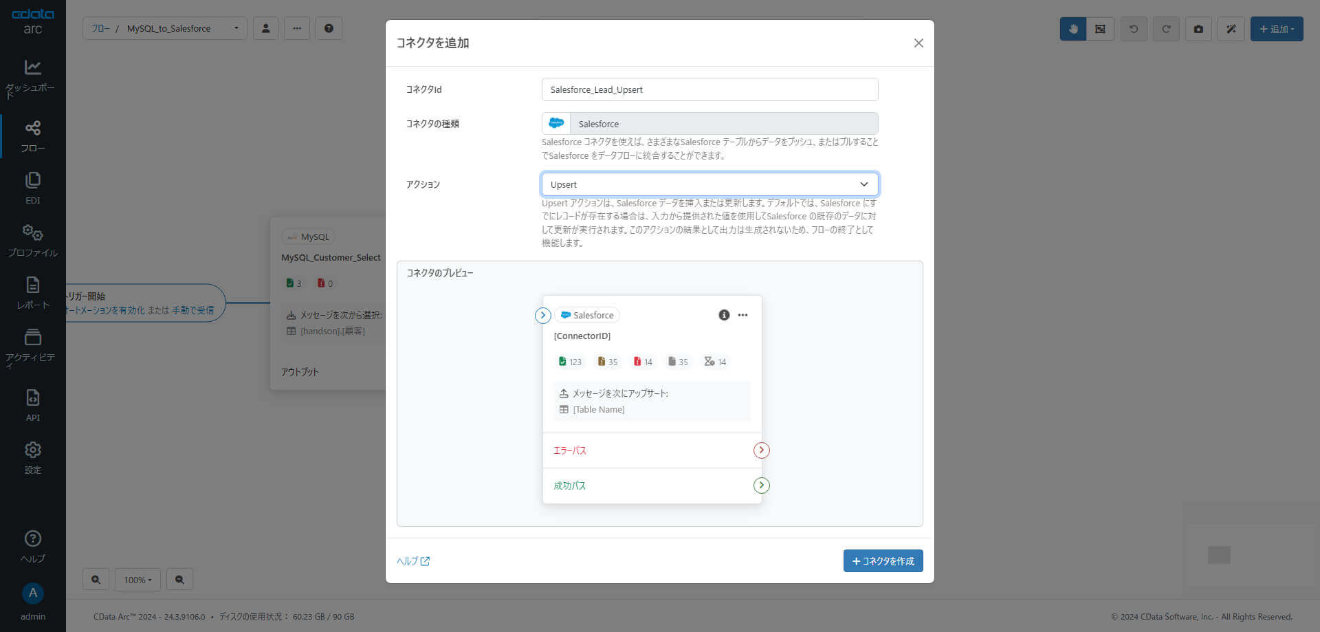 このコネクタが実行するアクションも指定します。ここではデータを更新するための「Upsert」アクションを選択して「+コネクタを作成」します。