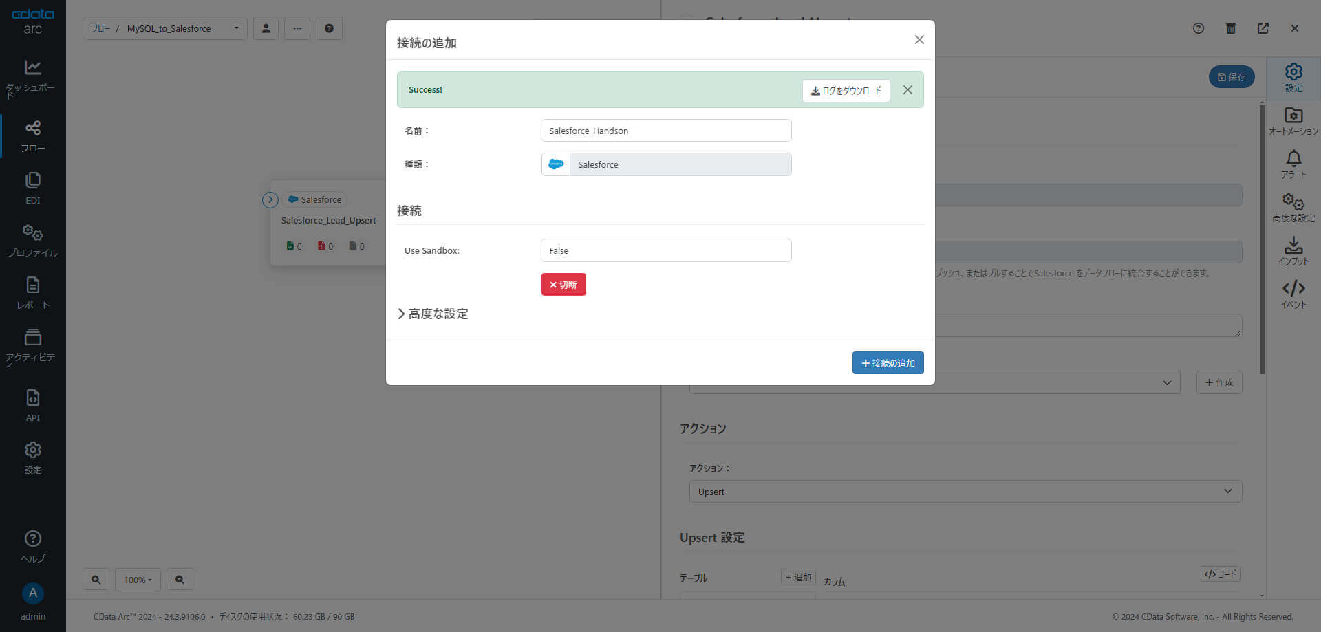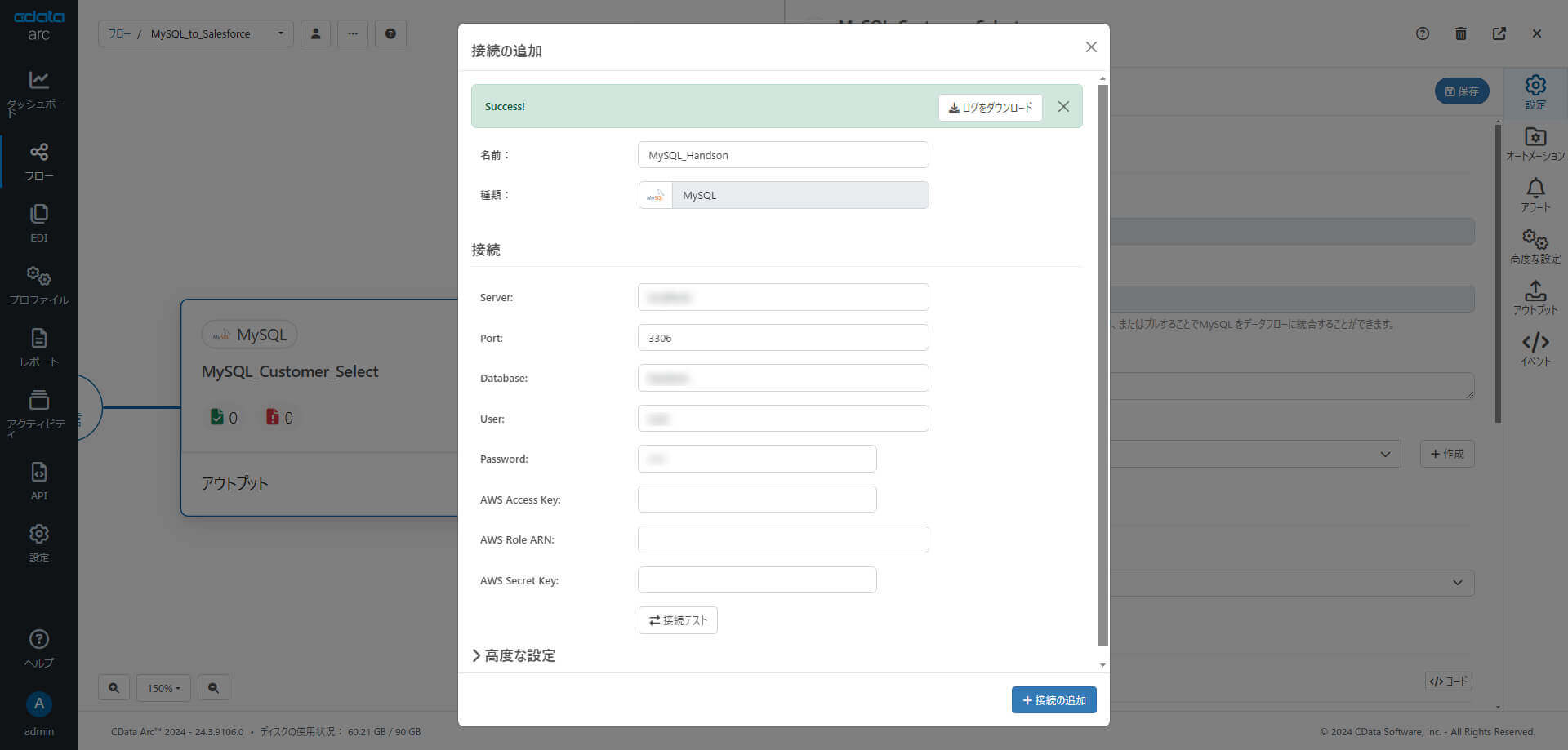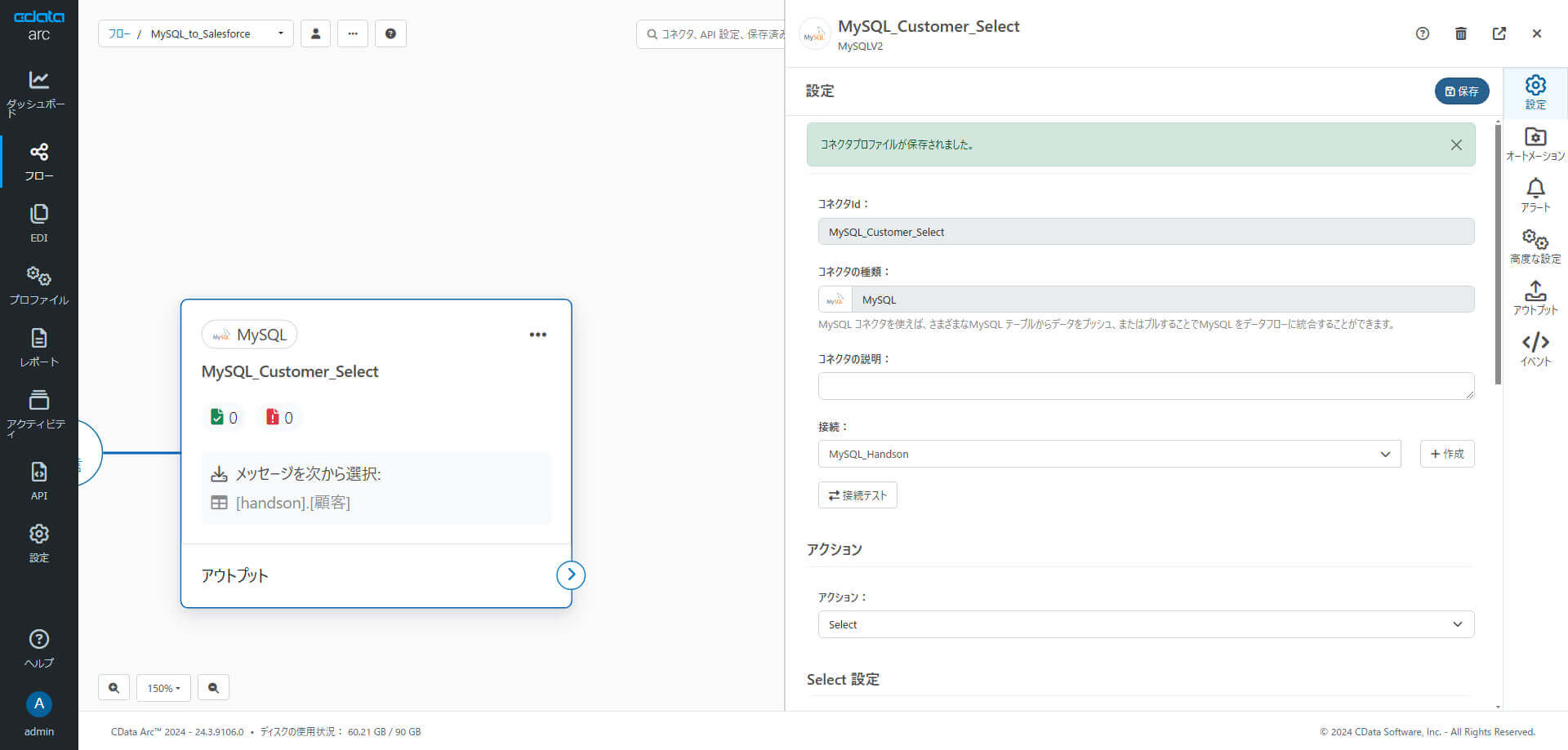 「保存」で、コネクタの設定を保存します。これでMySQL コネクタの設定は完了です。