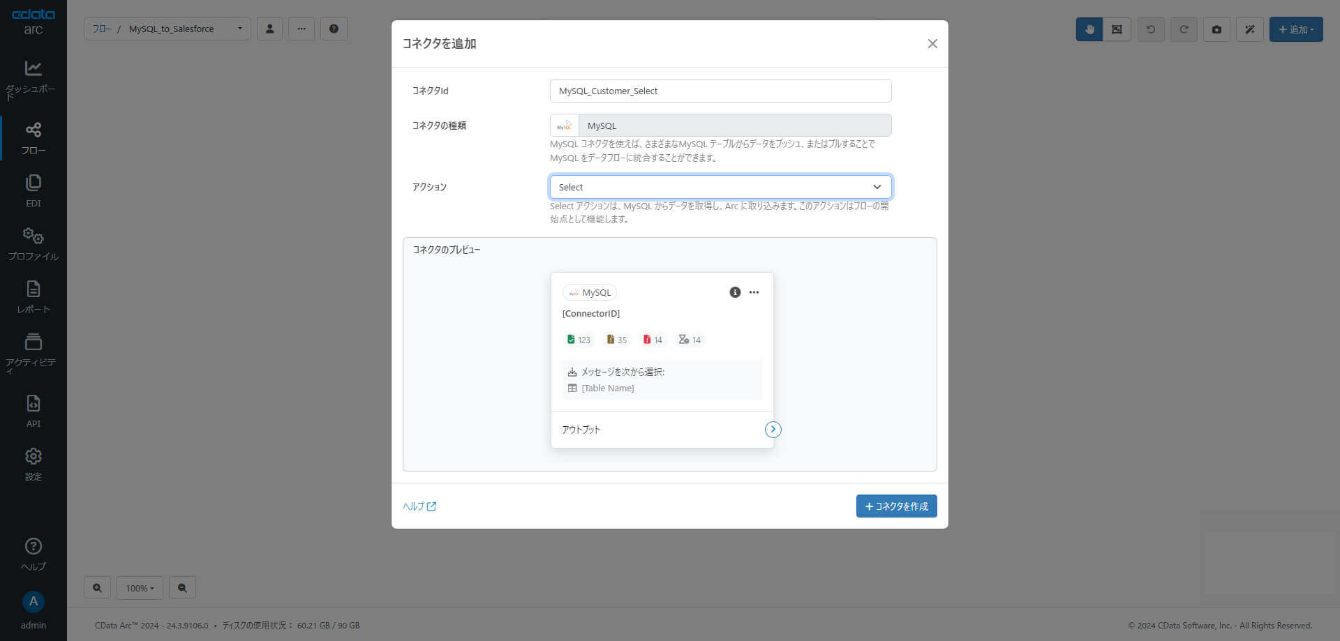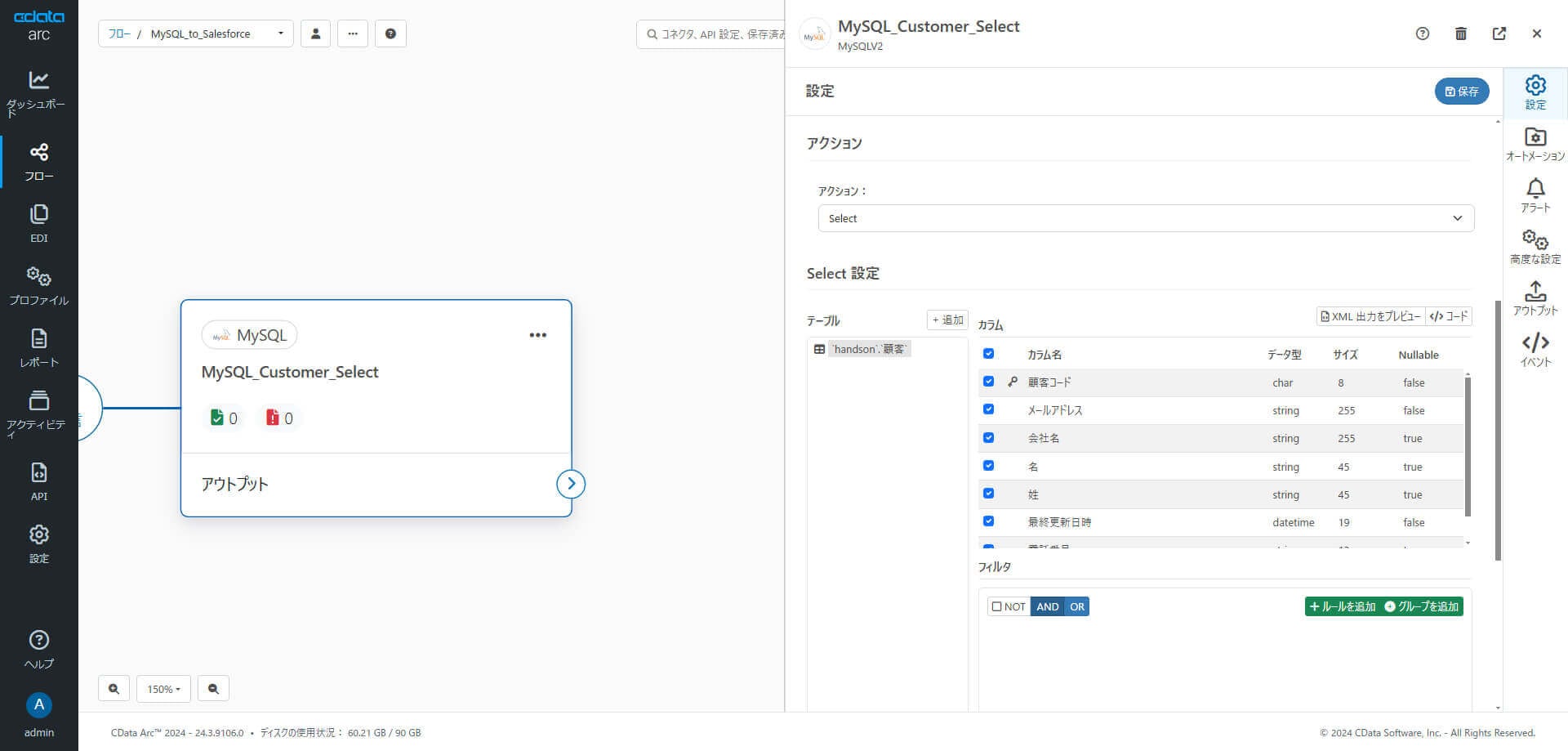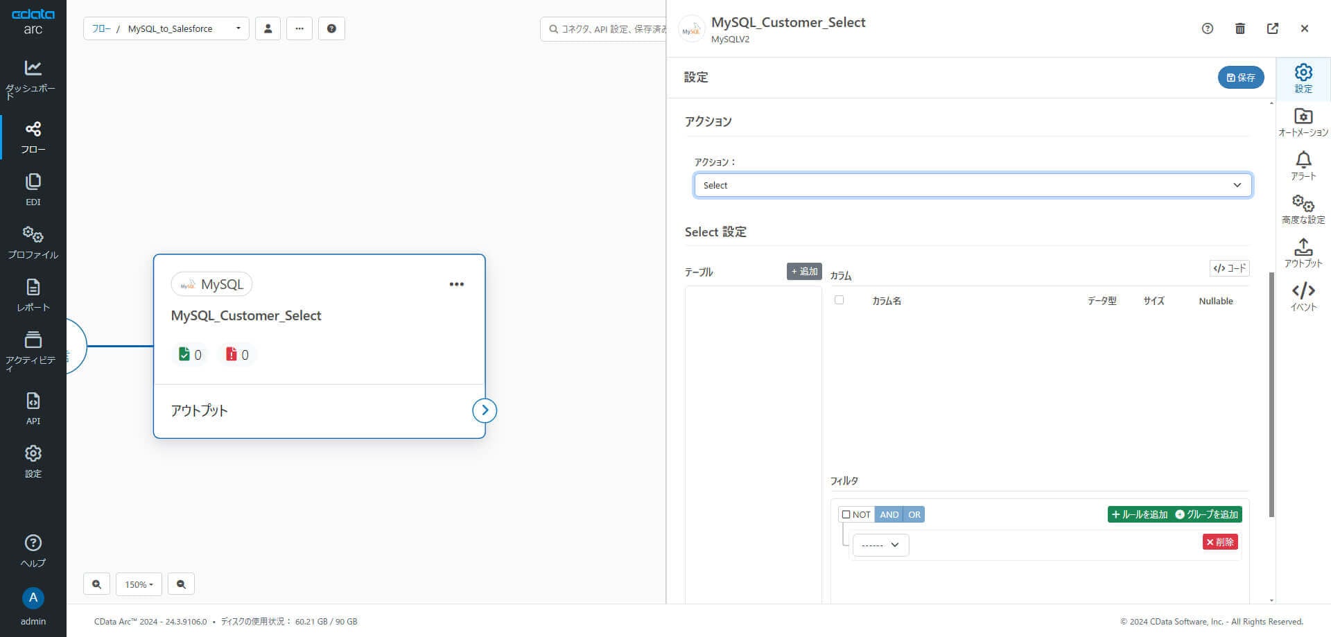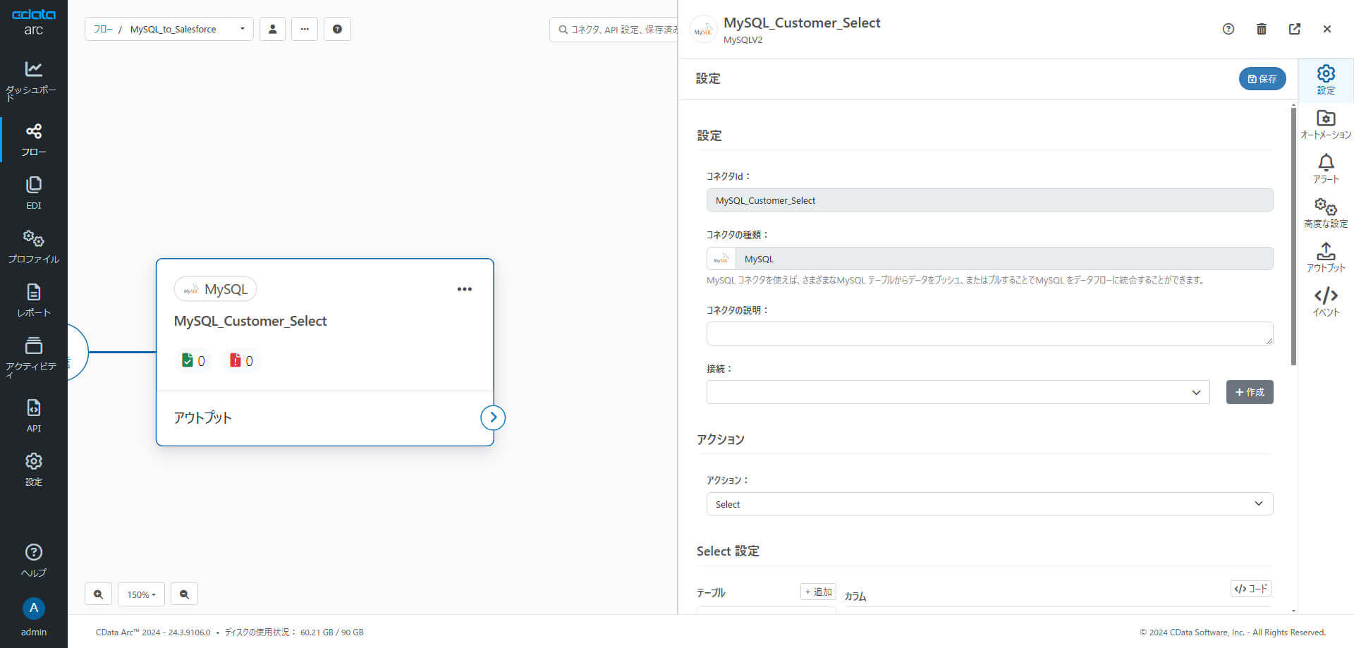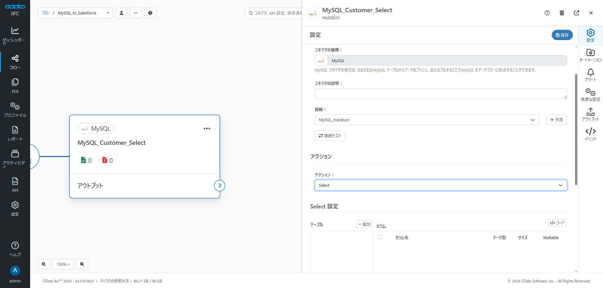 最初に「MySQL のcustomer テーブルからSelect(データを取得)」するMySQL コネクタを設定します。この連携フローのはじまり(起点)となるコネクタです。