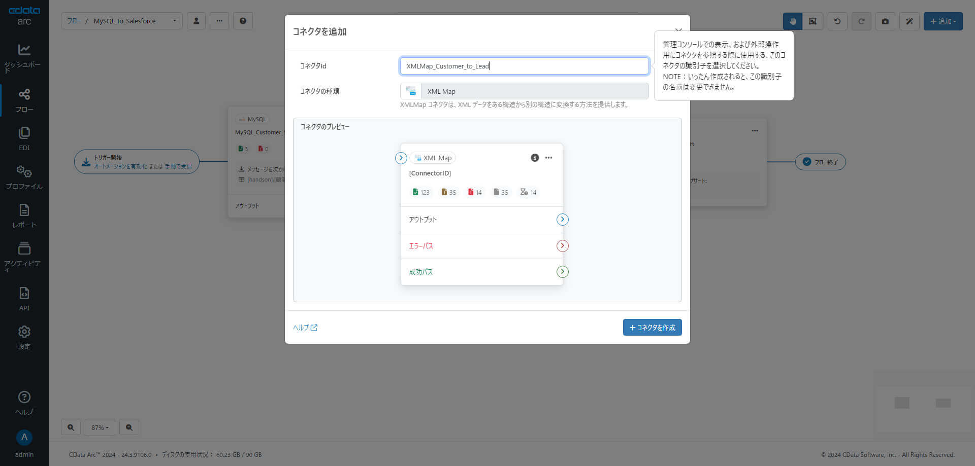 コネクタID には任意の名称を設定することができます。何を行うコネクタか、分かりやすい名前を設定します。ここでは「XMLMap_Customer_to_Lead」と設定します。