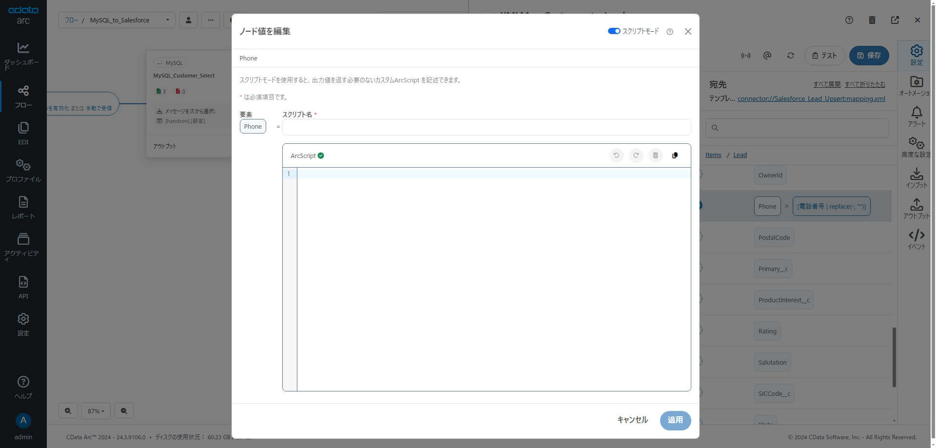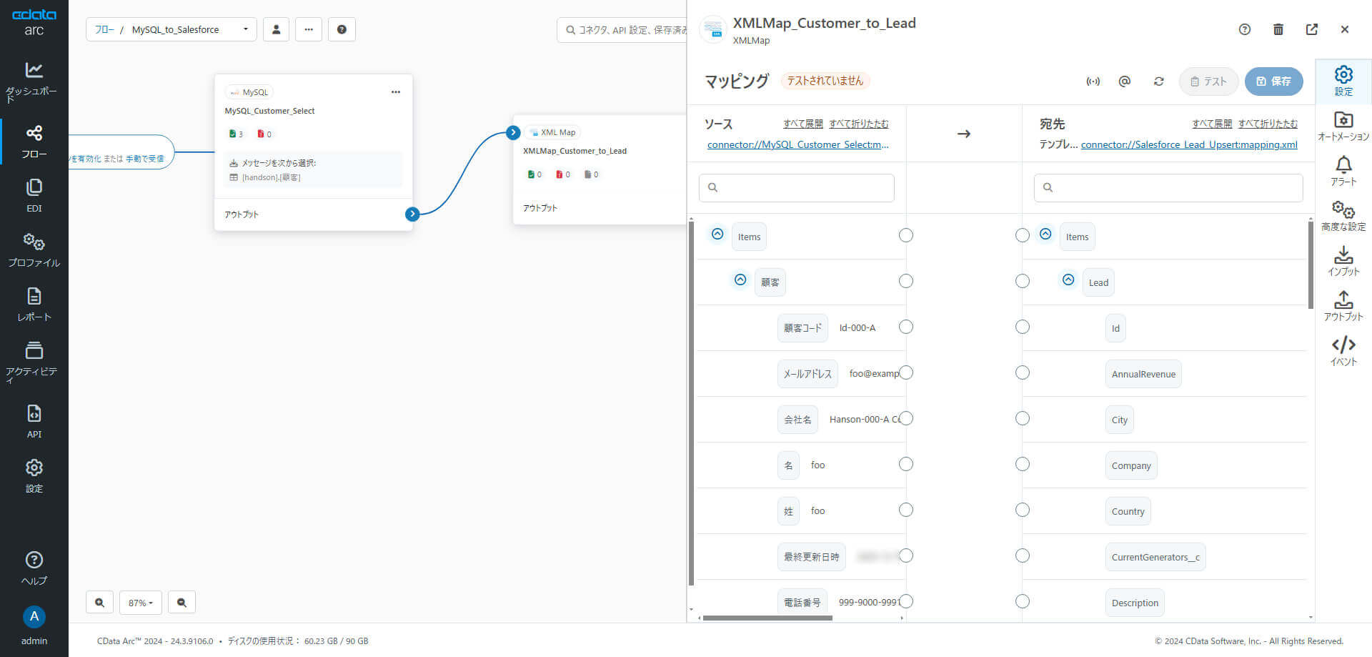 下記の項目を「データソース」から「宛先」にマッピングします。Salesforce ではデータの登録時にId が自動採番されます。このシナリオでは、MySQL 側の主キーである「顧客コード」はSalesforce Lead の「Description(説明)」に連携します。