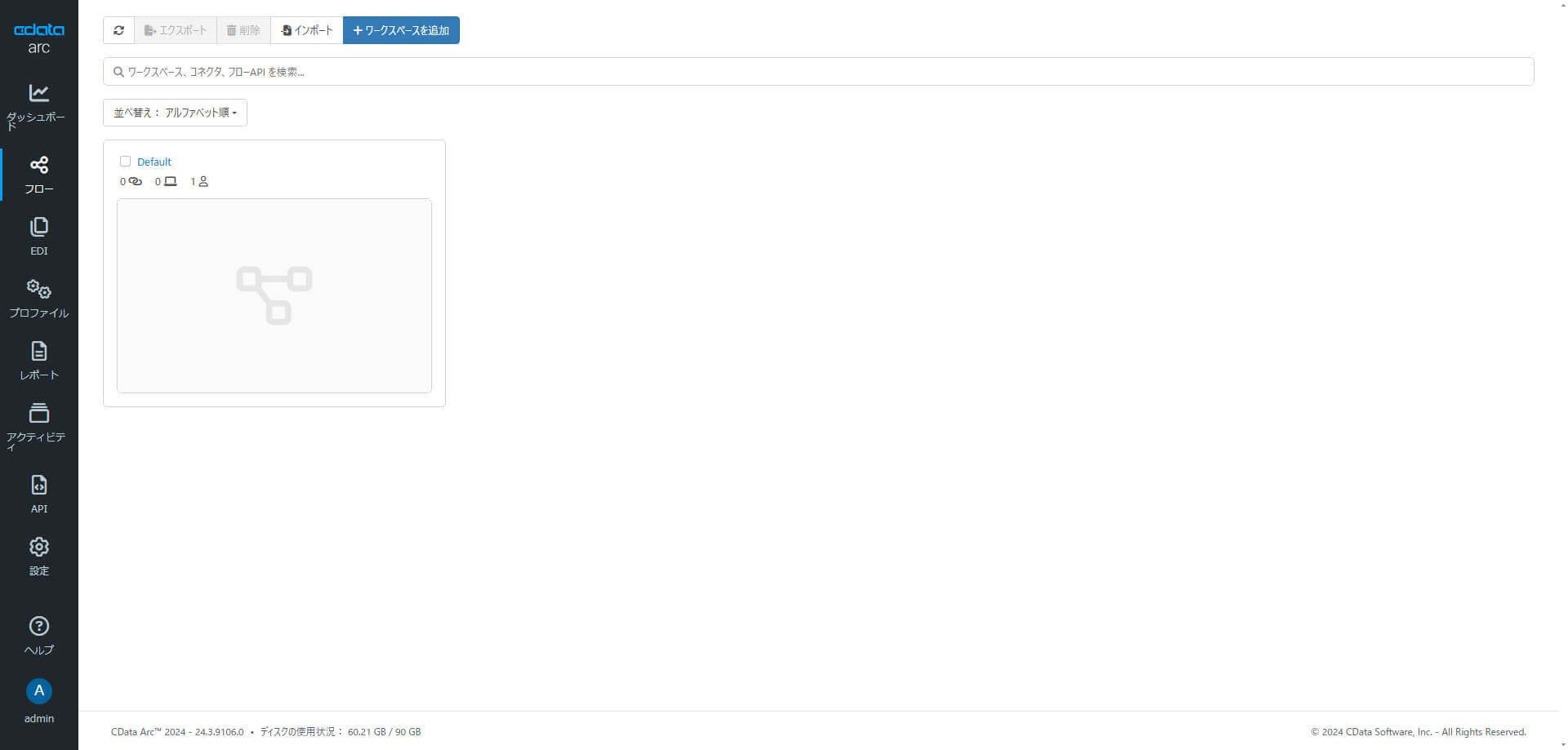 CData Arc では、目的の異なる連携フローを分離できるように、任意の「ワークスペース」を作成することができます。ワークスペースを作成するにはフローページの「ワークスペースを追加」をクリックします。