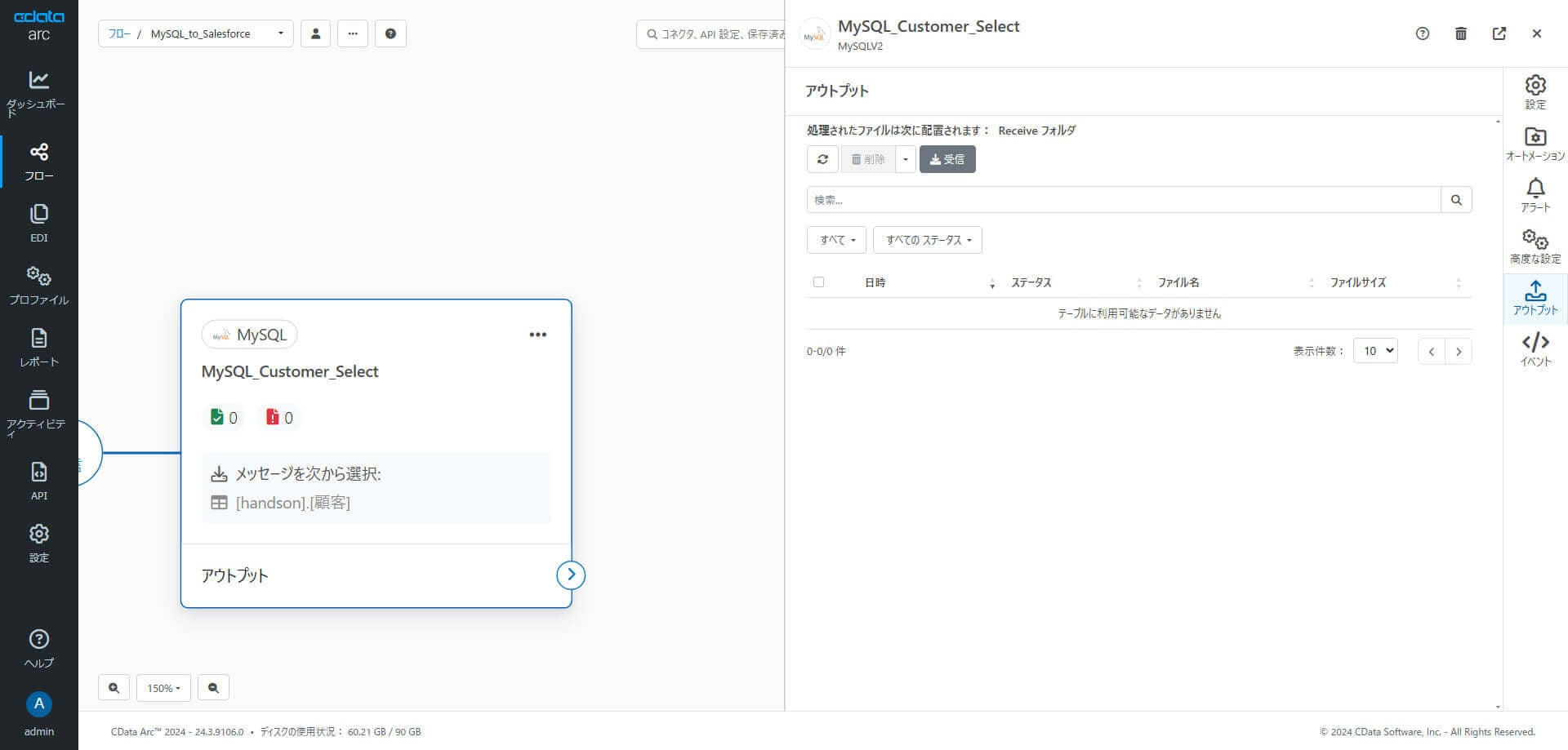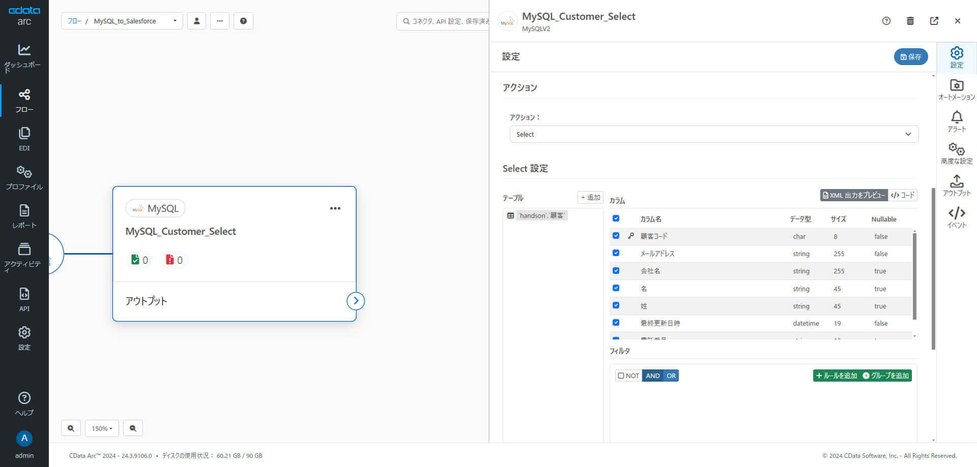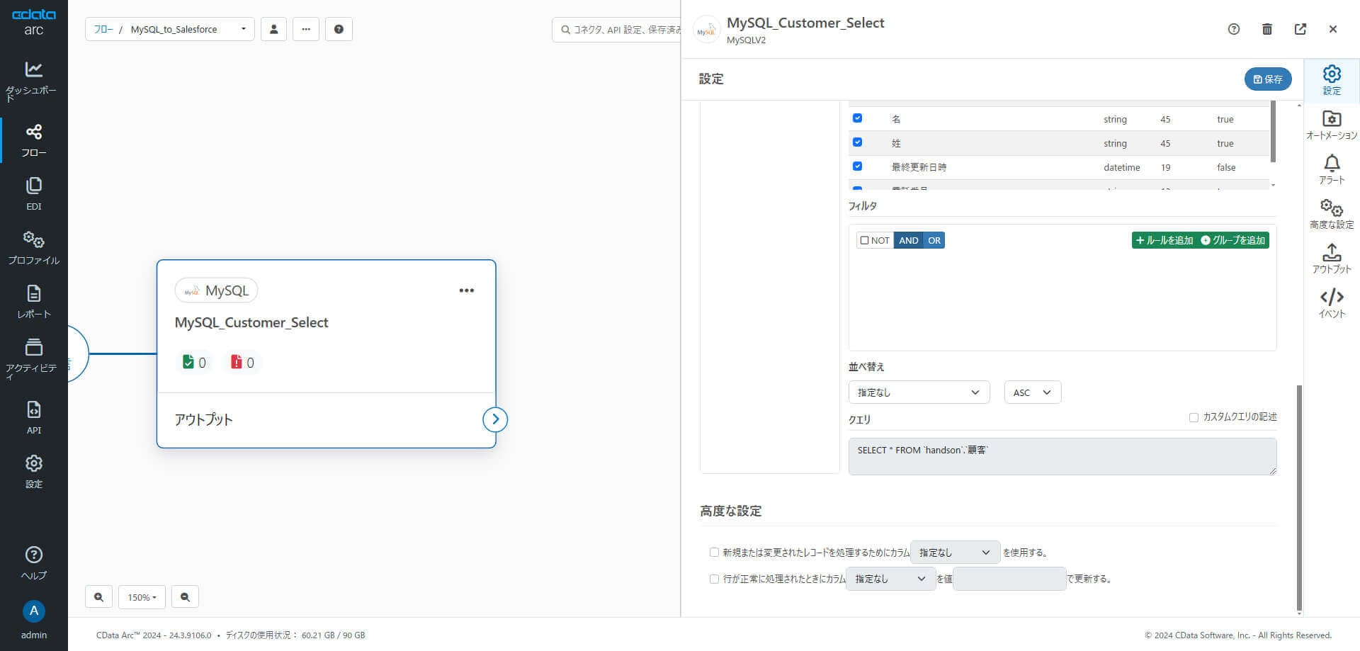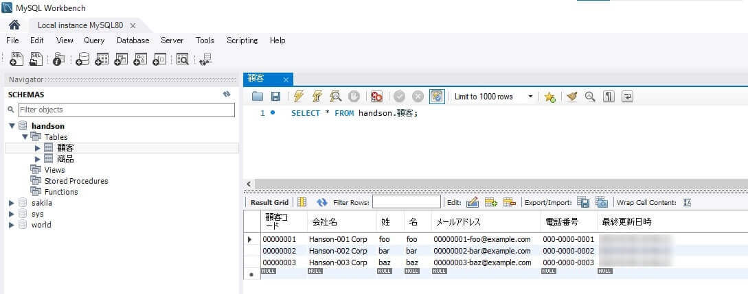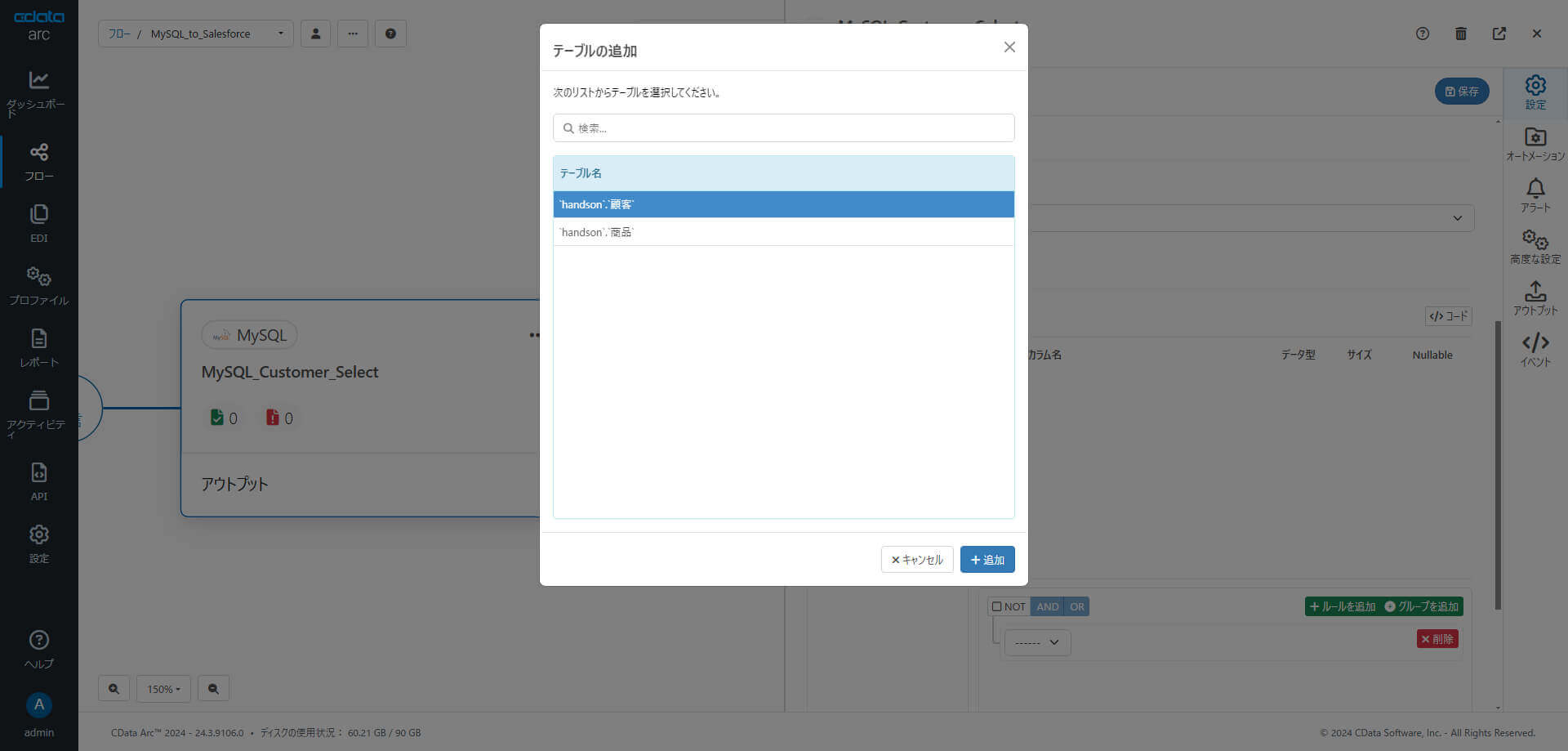 このシナリオでは、ハンズオン実行環境に構成されているMySQL のhandson スキーマの「顧客」テーブルからデータを取得します。