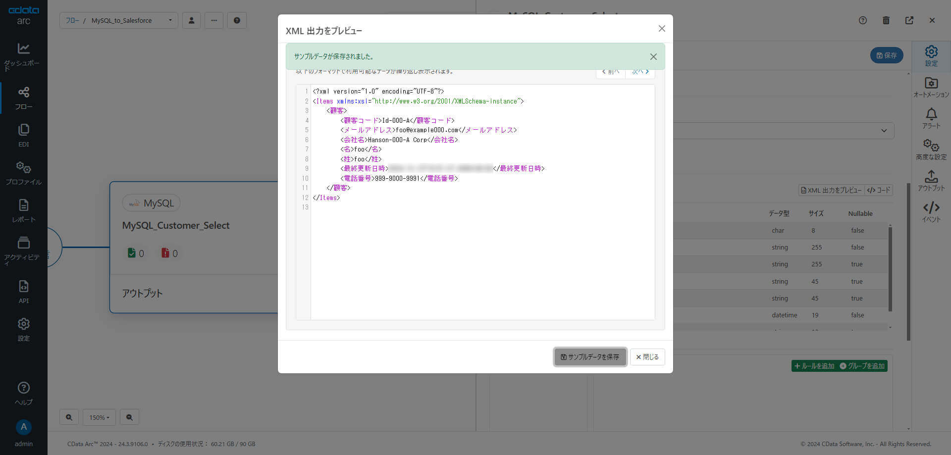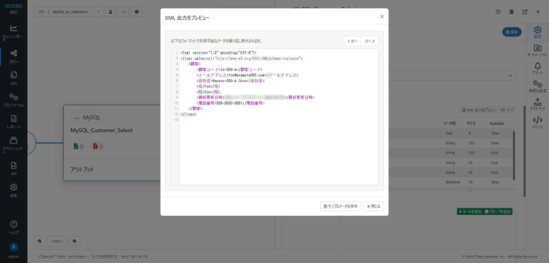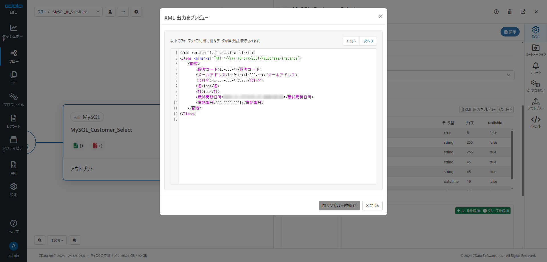 「XML 出力をプレビュー」することで、コネクタからの出力データをプレビューすることができます。プレビューにより取得されるデータを簡単に確認することができます。