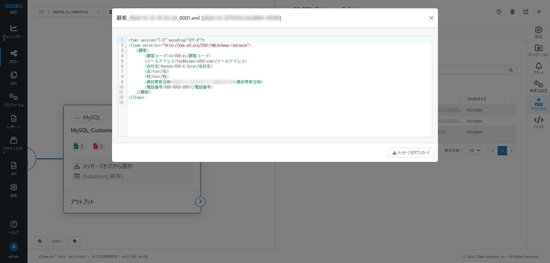 XMLMap コネクタの「インプット」「アウトプット」でMySQL コネクタから渡されたメッセージファイルがマッピングされ、アウトプットされていることが確認できます。