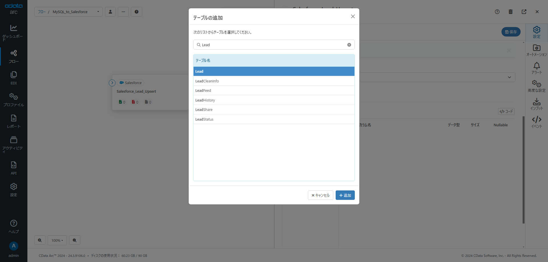 Lead テーブル(オブジェクト)を選択して「+ 追加」をクリックします。テーブル(オブジェクト)は検索ボックスで絞り込むこともできます。