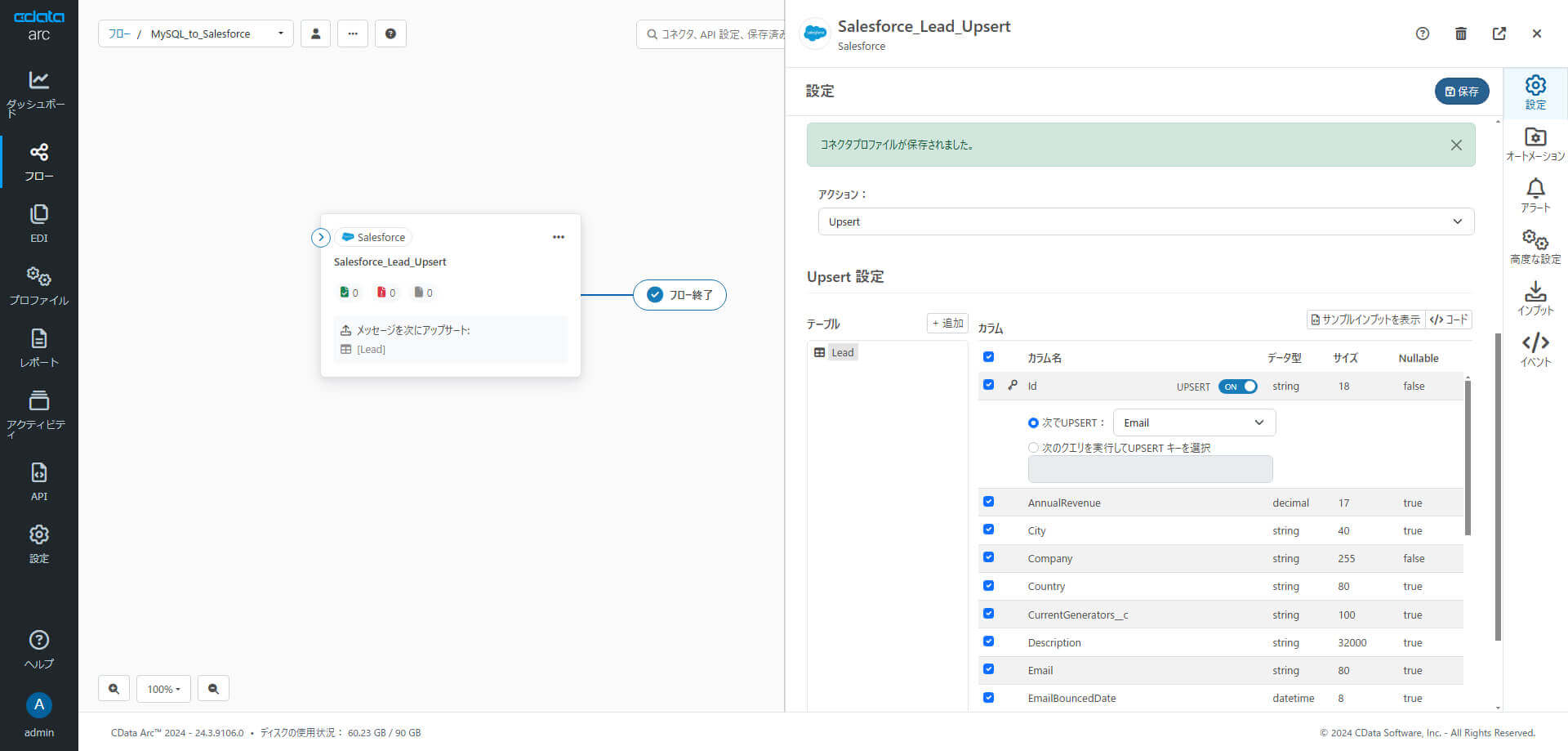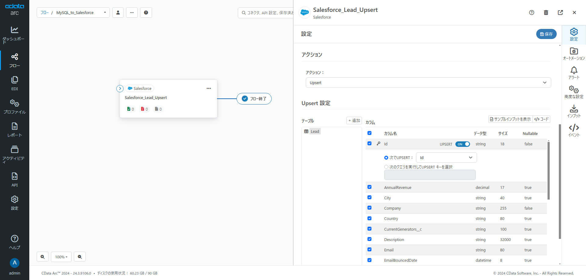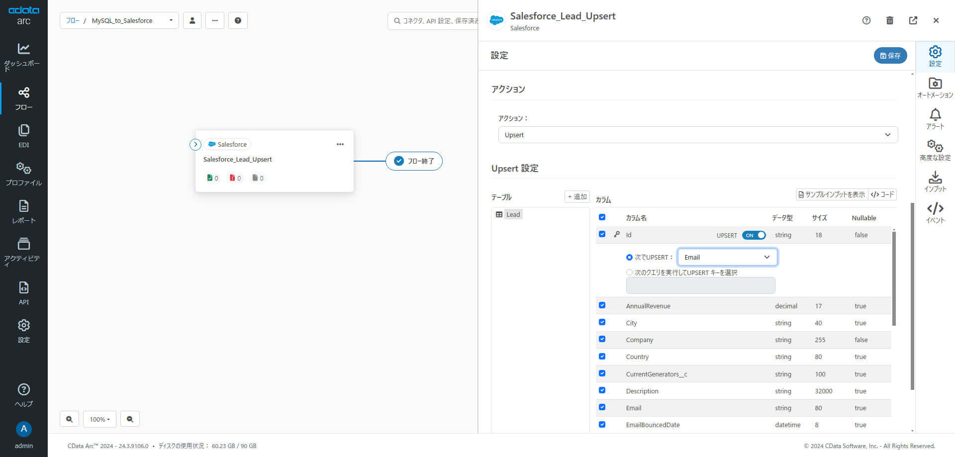 「テーブル」に「Lead」が追加され、「カラム」にLead テーブル(オブジェクト)の構成が反映されます。ここでは「Upsert の有効化」や「Upsert のKey」を細かく指定することができます。