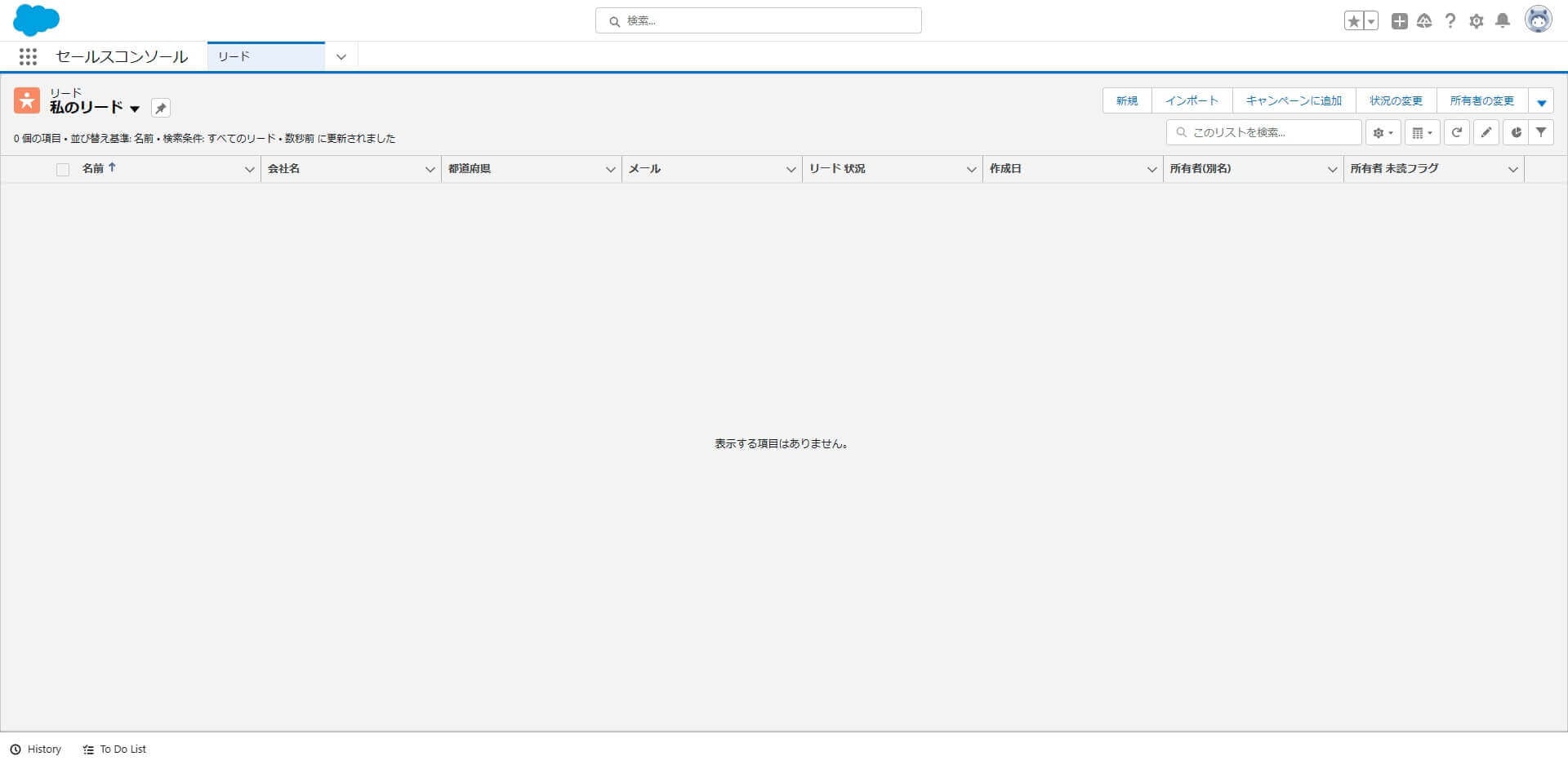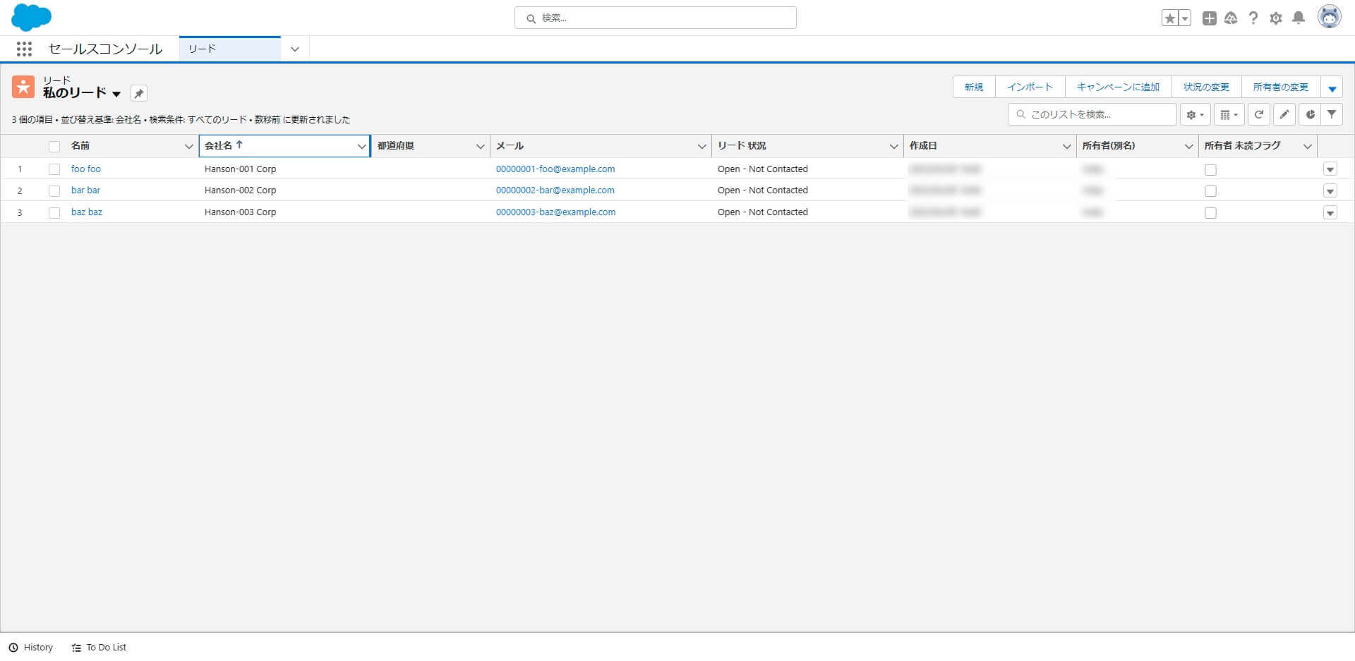 Salesforce のリードオブジェクトの内容を確認してみます。このハンズオンでは複数のSalesforce アカウントがそれぞれリードを登録しているので「私のリード」ビューで自分が連携を実行したデータが登録されているかを確認します。