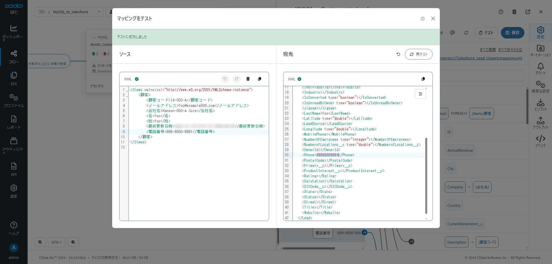 「テスト」をクリックすると、マッピングを実行した結果が「宛先」欄に出力されます。このシナリオではPhone の項目がハイフンなしに編集できていることがすぐに確認できます。