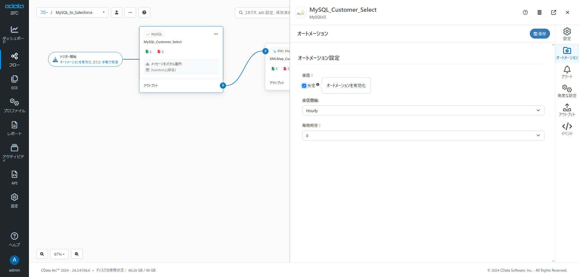 CData Arc にはスケジューリング実行するための機能が標準で搭載されています。開発・テストが完了した連携フローを自動で定期的に実行したいときに便利です。スケジュール実行はフローの起点となるコネクタで「受信オートメーション」を有効にすることで設定します。この設定は「トリガーを開始」の「オートメーションを有効化」からも開く事ができます。