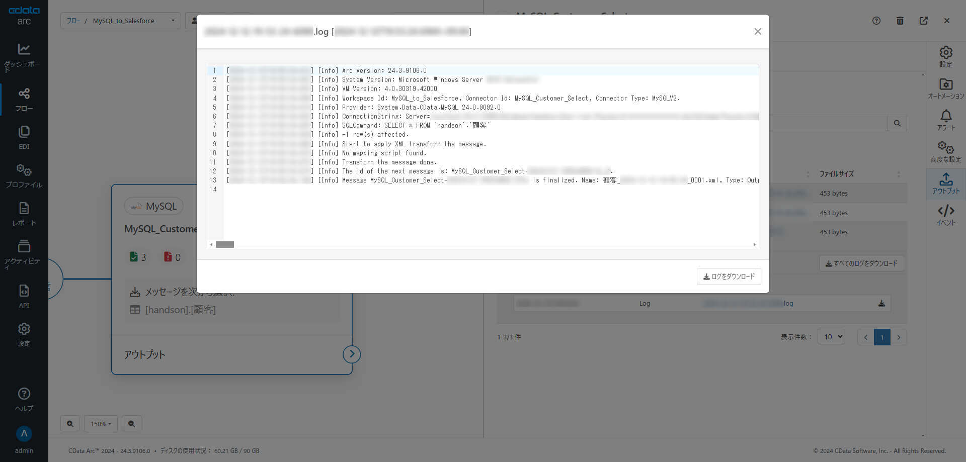 また各トランザクションレコード左端の「+」で展開すると、CData Arc が自動的に付与するメッセージファイルのメタデータ(メッセージヘッダ)やログの内容を確認することができます。メッセージファイルやログはダウンロードすることもできます。