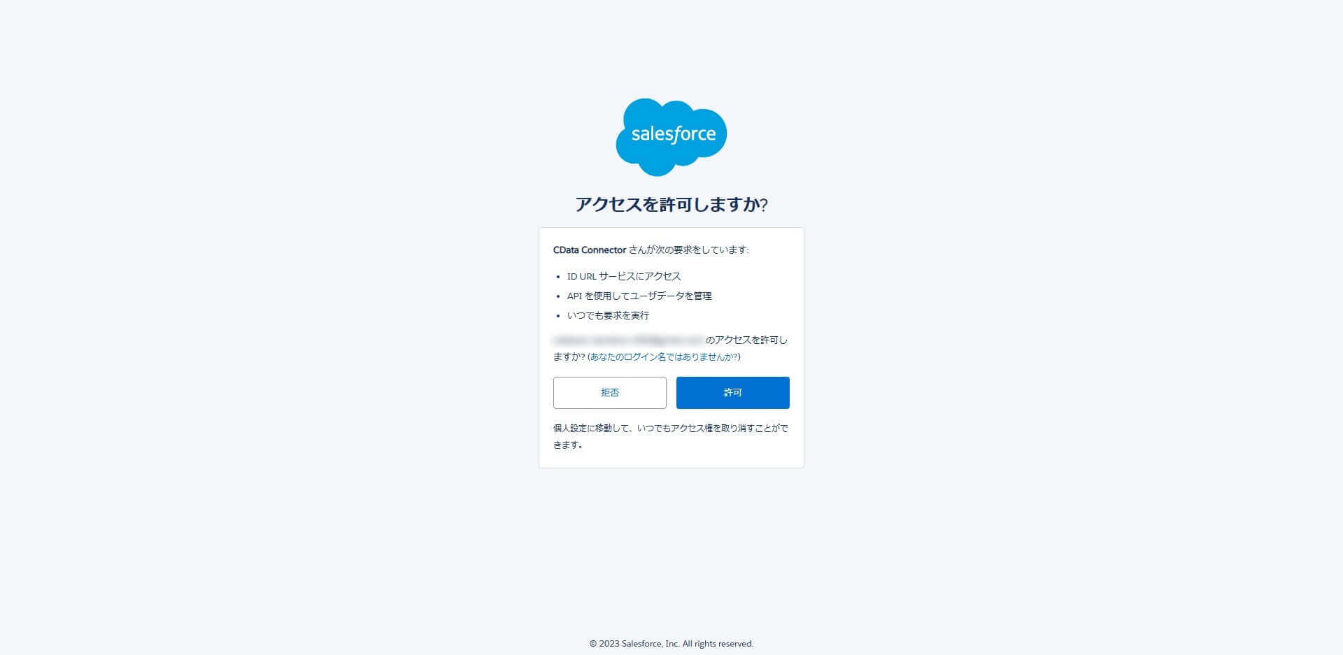 CData Arc から対象のSalesforce 組織にはじめてアクセスするときには、接続アプリケーションへのアクセス許可が確認されます。アクセスを「許可」します。