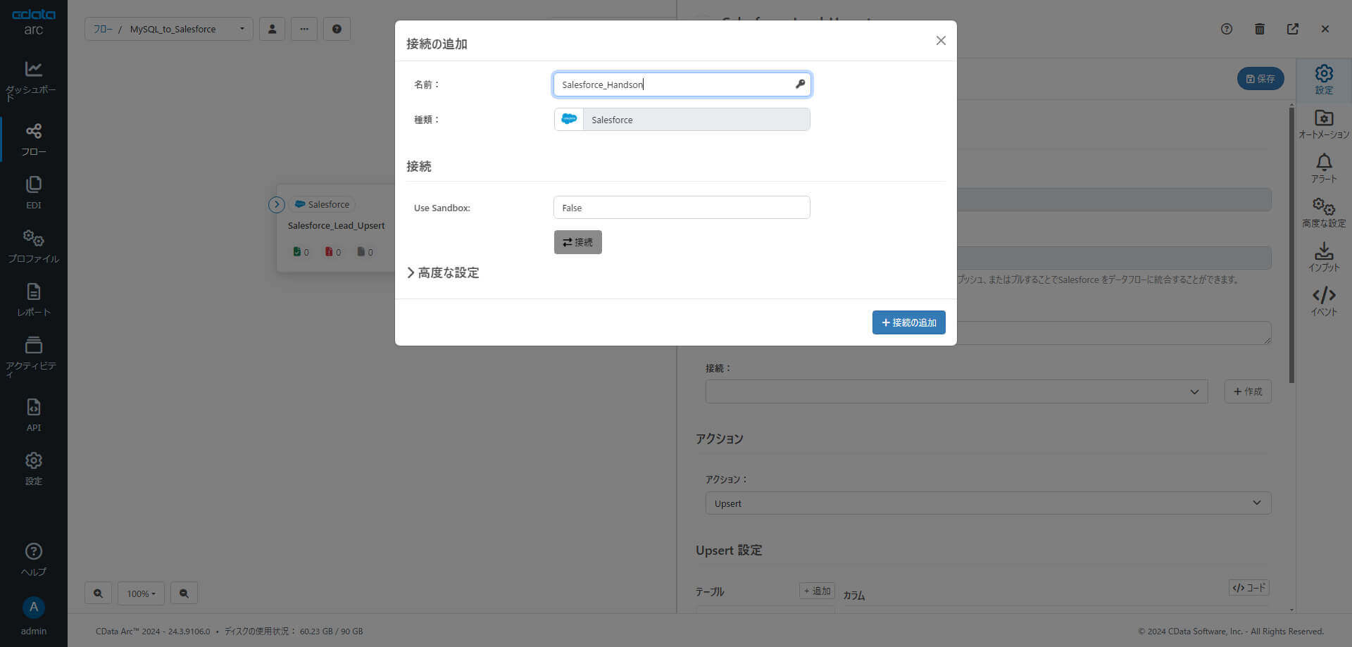「接続の追加」ダイアログで、ハンズオンで利用するSalesforce への接続を作成していきます。名前には任意の名称を設定することができます。識別しやすい名前を設定します。ここでは「Salesforce_Handson」と設定します。