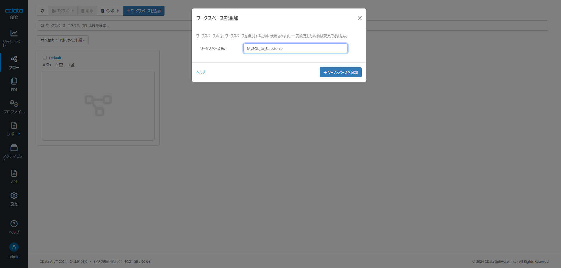 ワークスペース名には任意の名称を設定することができます。何のためのワークスペースか、分かりやすい名前を設定します。ここでは「MySQL_to_Salesforce」と設定します。