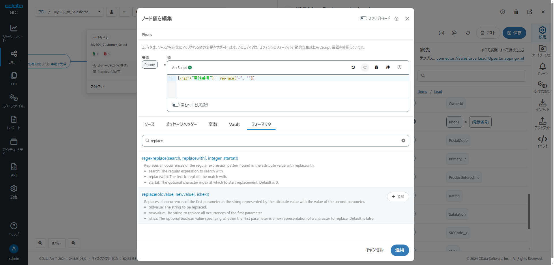 XMLMap のマッピングノードエディタでは、ArcScript のフォーマッタを利用してマッピング中にデータを動的に編集・加工することができます。ここでは replace フォーマッタを利用して「-」を除去します。