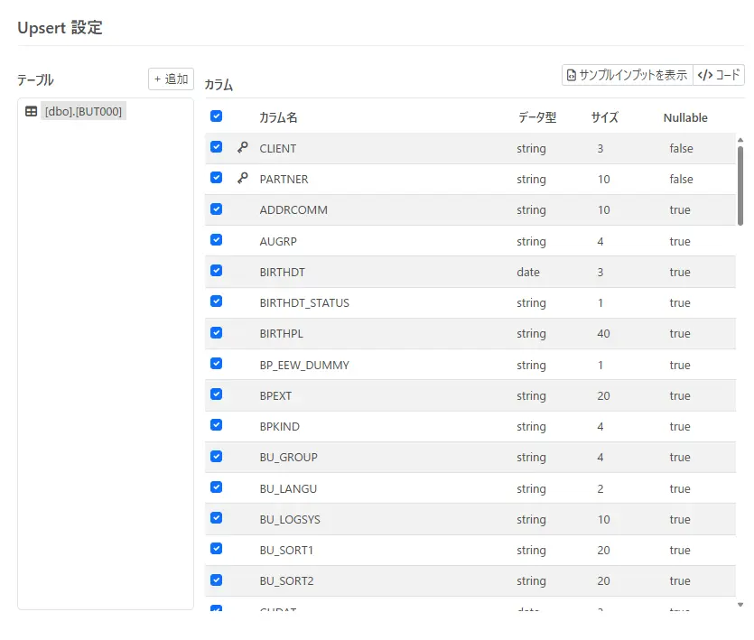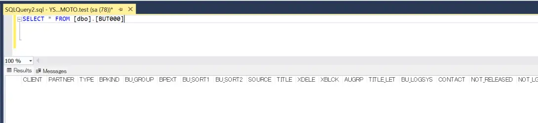 今回はビジネスパートナーのBUT000 テーブルを対象としたいと思いますので、SQL Server 側には事前に同じ構成のテーブルを用意しました。