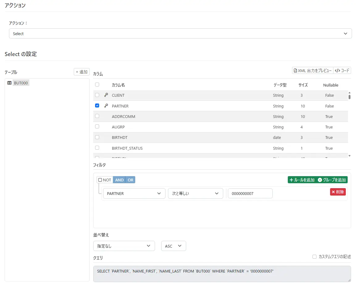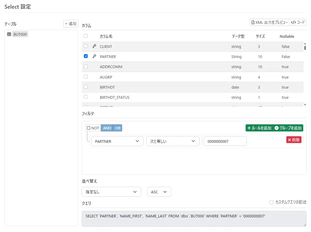 そしてBUT000 テーブルを選択します。不要な項目が多いため、後続のXMLMap でマッピングがしやすいように「PARTNER」、「NAME_FIRST」、「NAME_LAST」以外のカラムのチェックを外します。また更新したデータのみを取得したいので、フィルタ条件で該当の「PARTNER」を指定します。