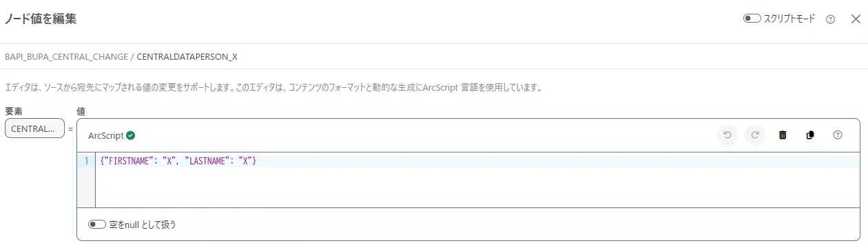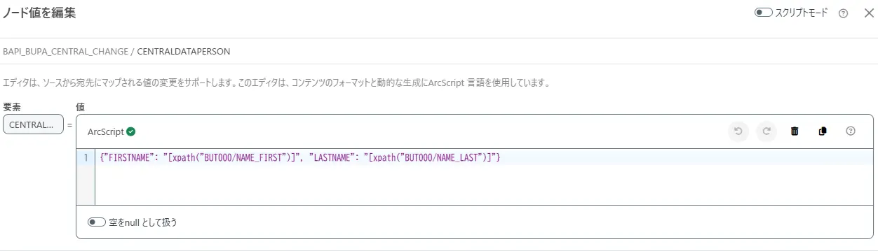また更新したデータを反映するため、宛先の「CENTRALDATAPERSON_X」にも、以下のようなJSON を入力します。