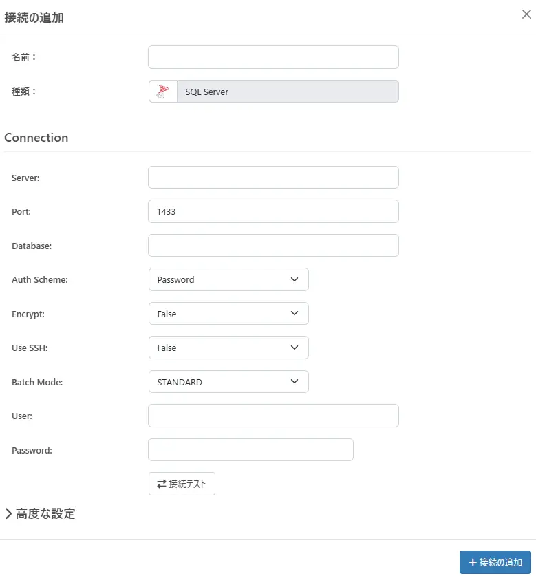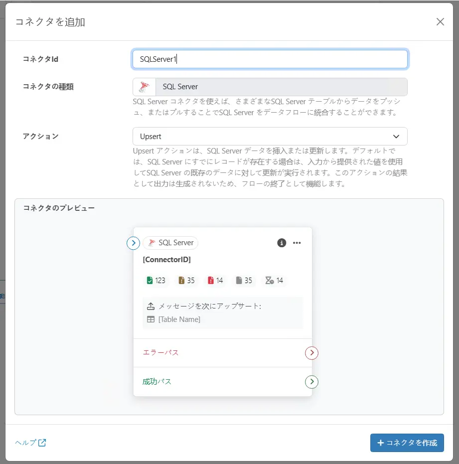 追加された「SQL Server コネクタ」を開き、接続を作成します。接続設定についてはヘルプをご参照ください。