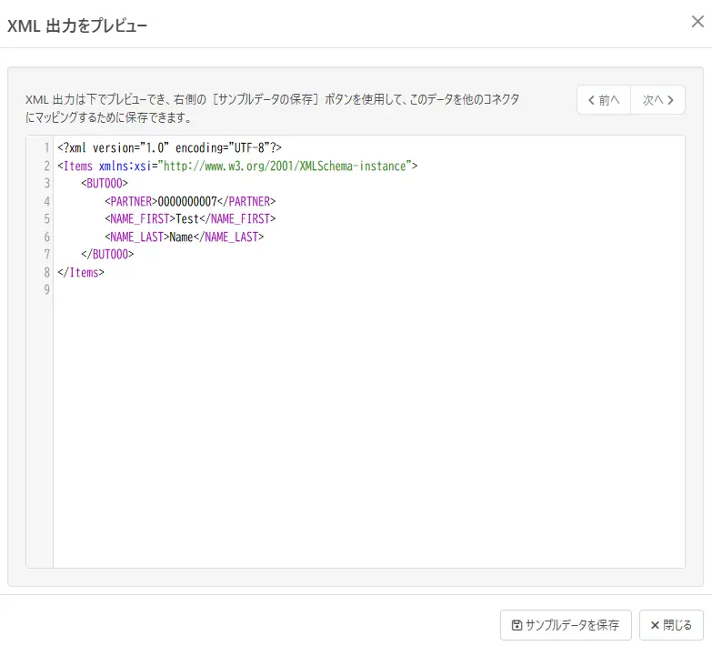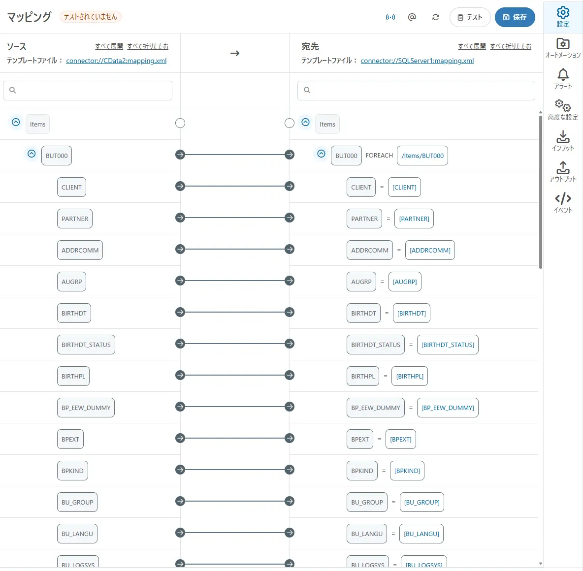 「XMLMap コネクタ」を開いて、連携する項目を以下のようにマッピングします。