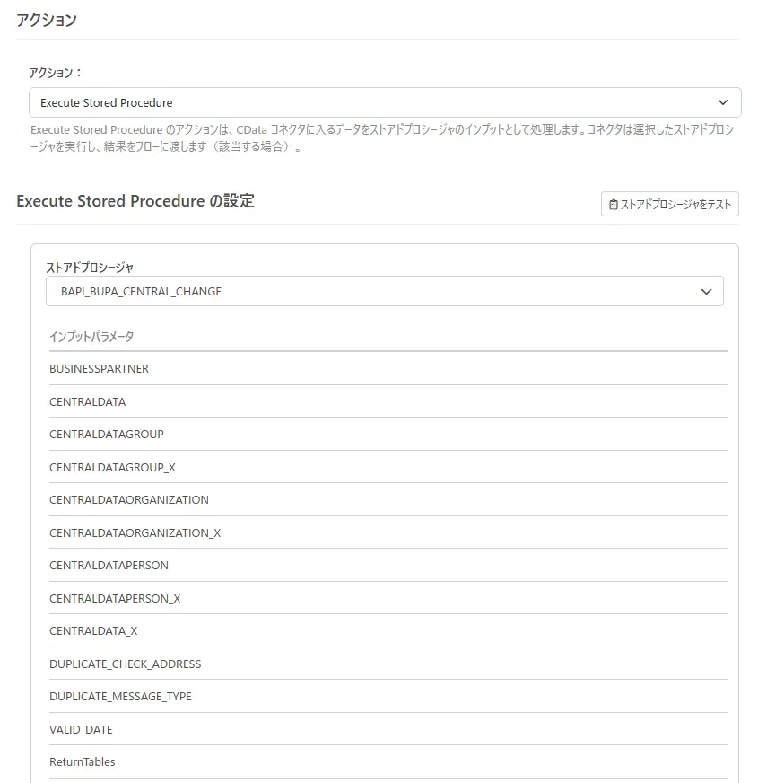 そして「Execute Stored Procedure アクション」の「CData コネクタ」を追加して、BAPI_BUPA_CENTRAL_CHANGE プロシージャを選択します。