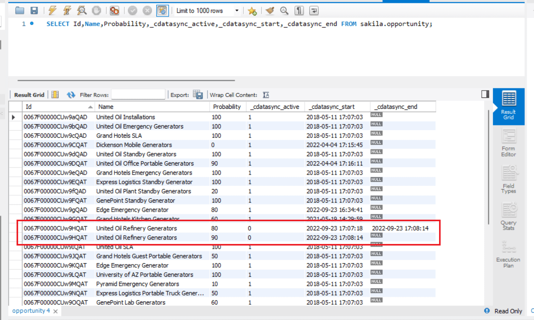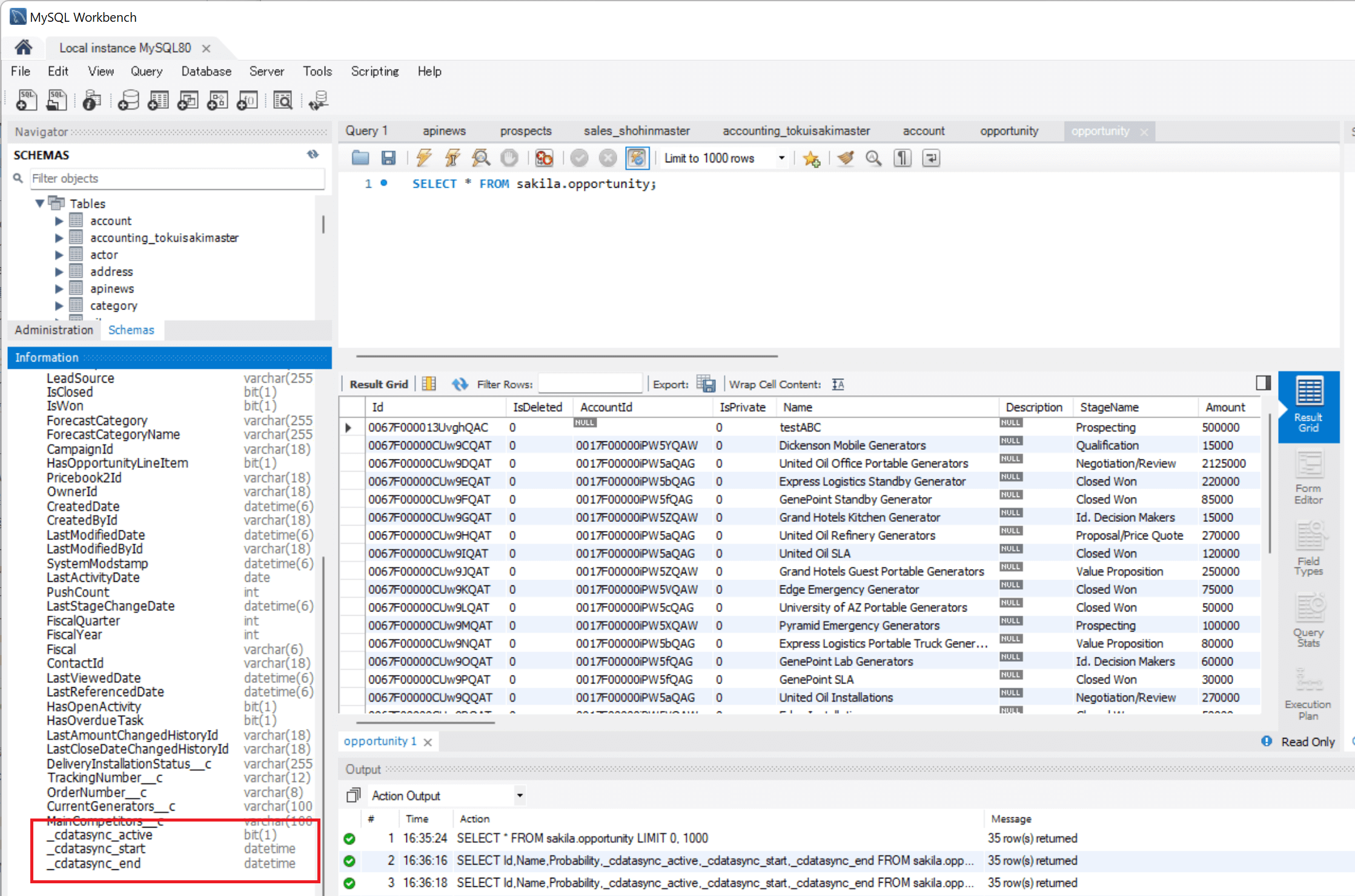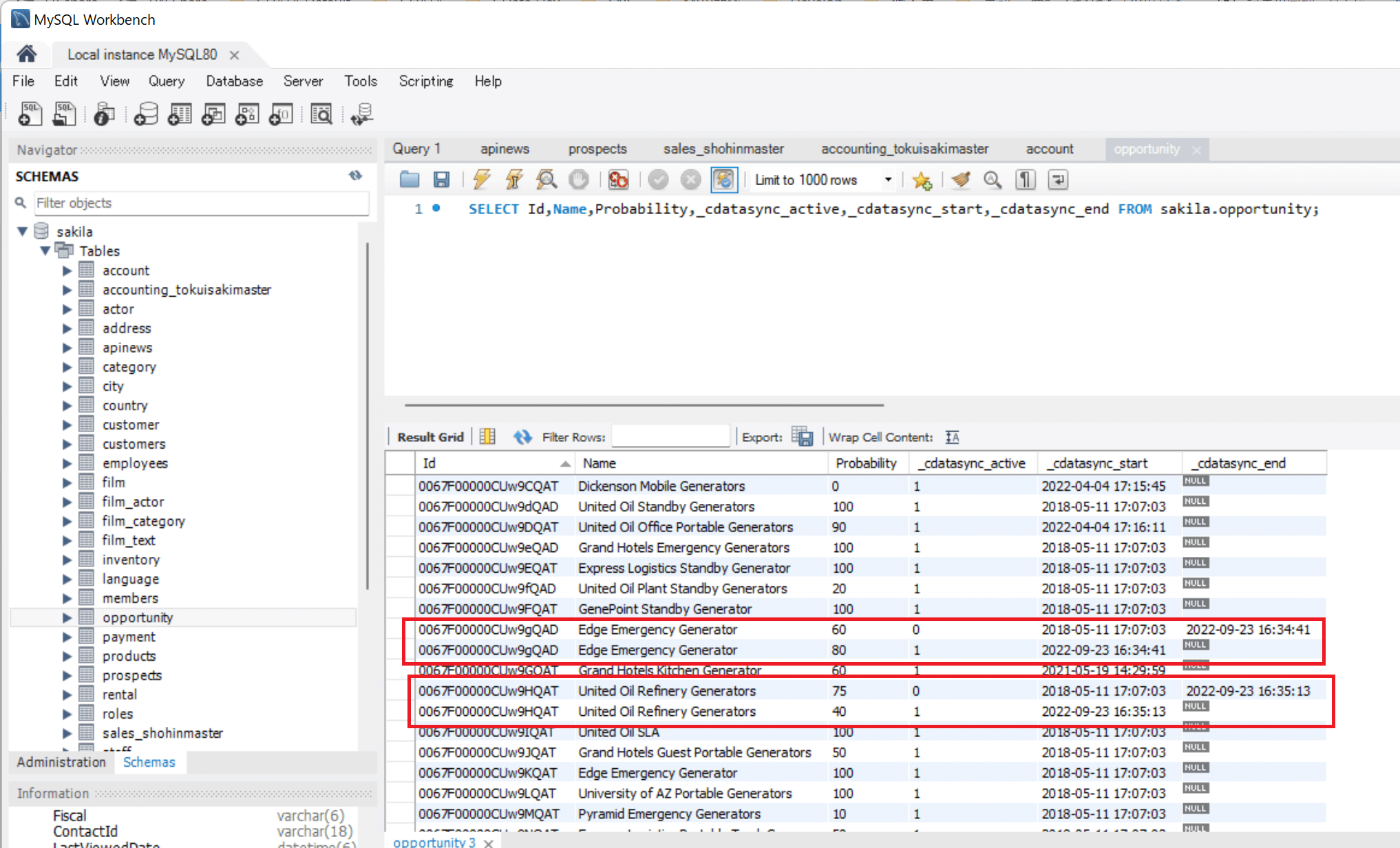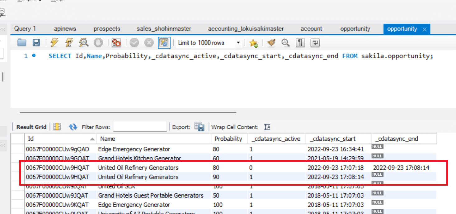 MySQLのデータを見てみると、80%の確度だったデータの「_cdatasync_active」が「0」になり、「_cdatasync_end」に非アクティブ状態となった日付が入力されました。