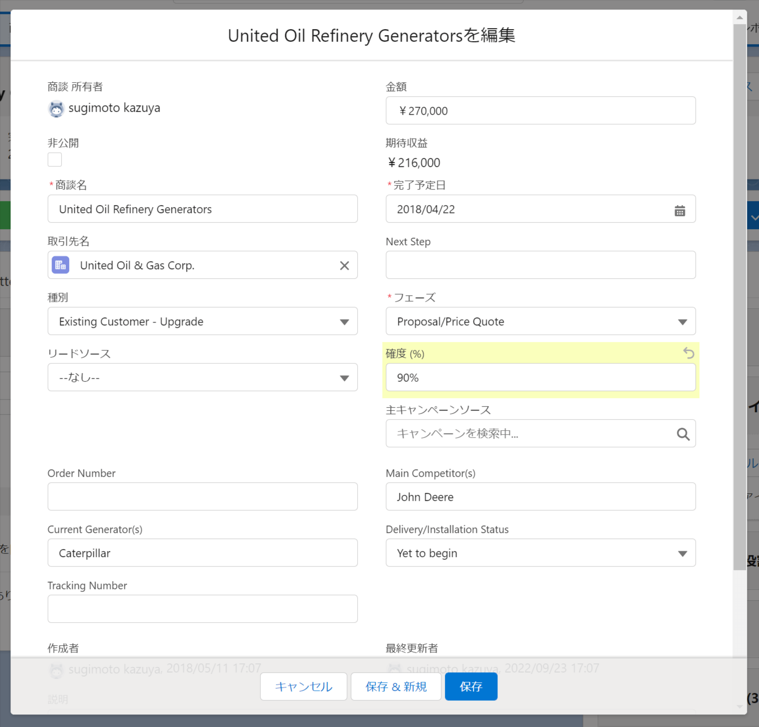 これにより、「Edge Emergency Generator」のデータの受注確度(Probability)が「60」から「80」に変わっていることがわかります。