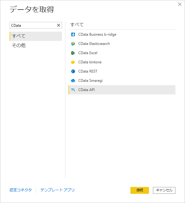 データ接続先一覧の中から「CData API」を選択し、「接続」をクリックします。