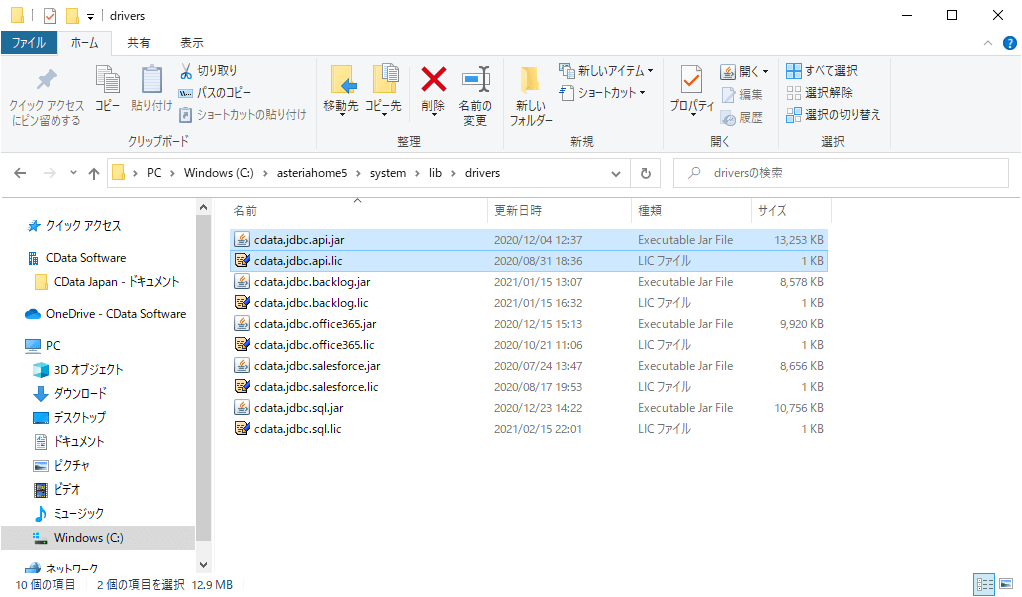 CData JDBC API Driver はインストール後、「cdata.jdbc.api.jar」と「cdata.jdbc.api.lic」のファイルをAsteriaのドライバーフォルダ(asteriahome5\system\lib\drivers)に登録します。