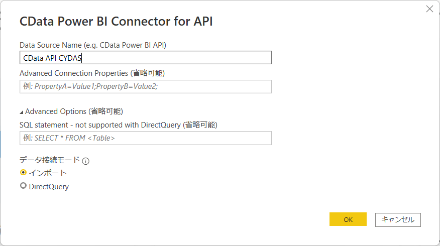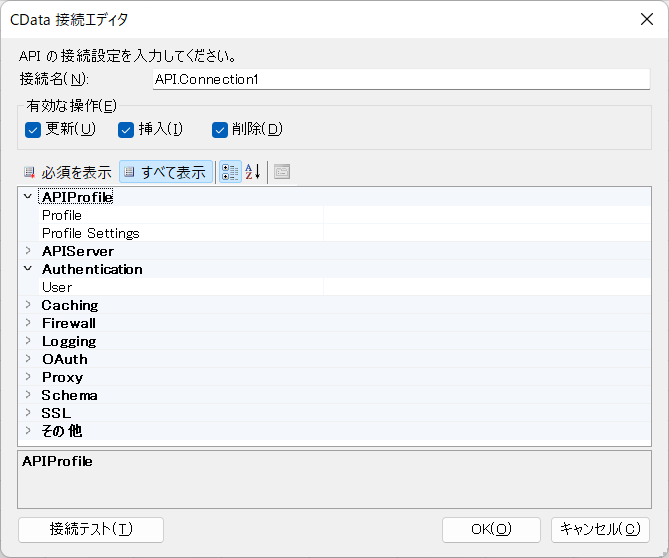 最初に接続するためのウィザードが表示されるので、「CData API Driverのインストール」の内容と同様に各種パラメータを入力します。