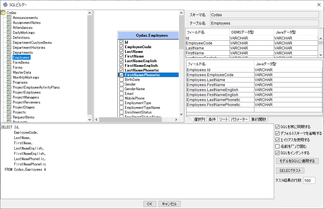 あとは、「モデルにSQLを適用する」をクリックし「SELECTテスト」でデータが正常に取得できているかを確認します。