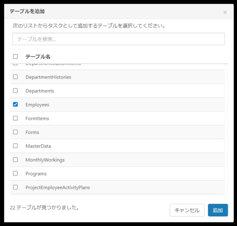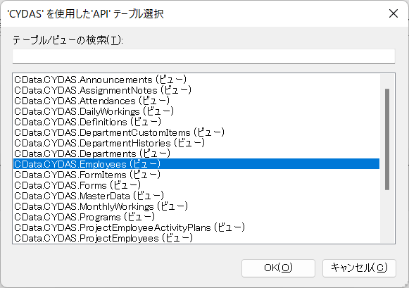 テーブルの一覧が表示されるので、任意のテーブルを選択し「OK」をクリックします。