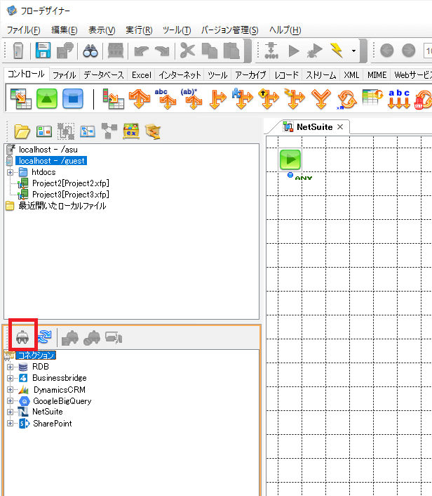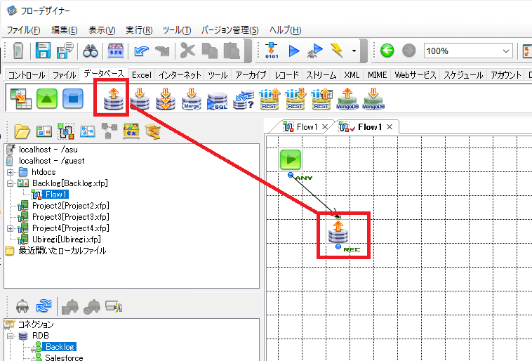 これでコネクションの作成は完了です。あとは、フロー上でデータベースタブにある「RDBGet」のコンポーネントを使って、データの取得が行なえます。