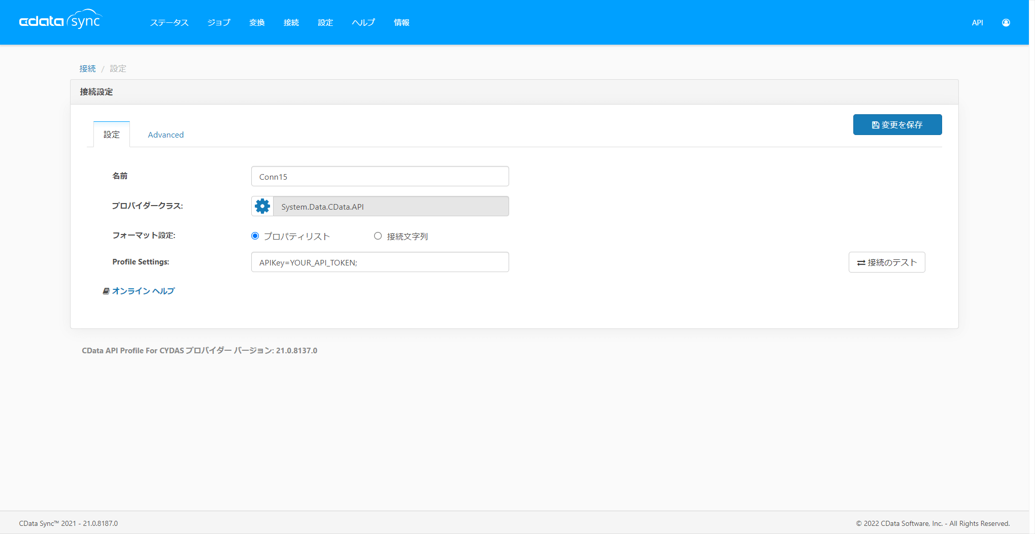 なお、CData Sync Windows版の場合は「CYDAS.apip」のプロファイルをSyncの本体が存在するフォルダの「www\app_data\profiles」に配置してください。profilesフォルダが存在しない場合は手動で作成してください。