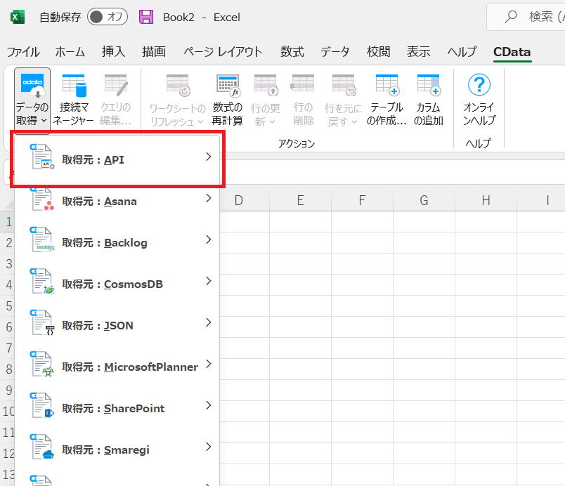 CData Excel Add-in for API をインストール後、Excelを立ち上げるとCDataタブが追加されていることがわかります。このタブから各種操作を実施します。