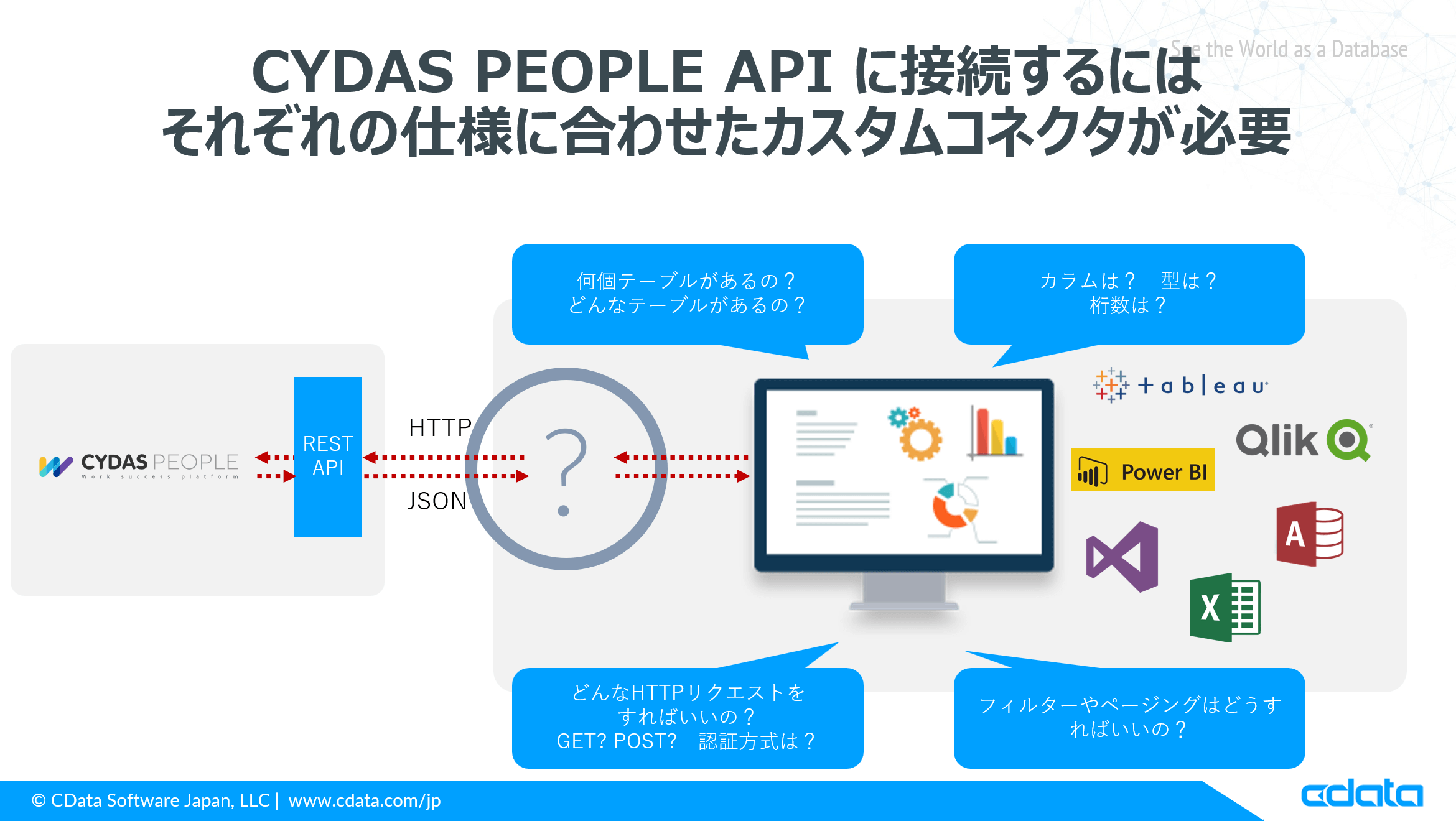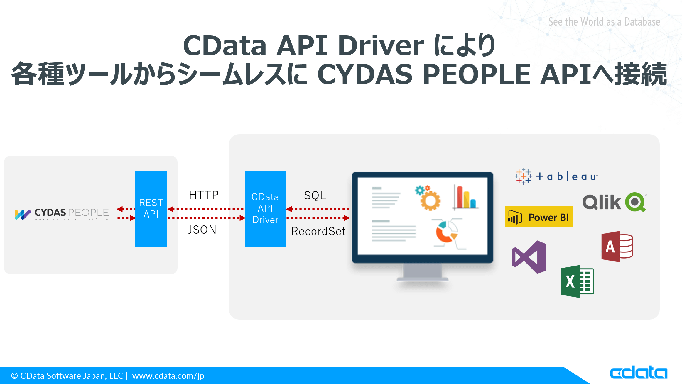本記事では、各種 Web API を ODBC / JDBC / ADO.NET といった標準のDB接続規格でアクセスできるようにするCData API Driverを用いて、CYDAS PEOPLE の API を各種ツールから接続する方法を紹介します。