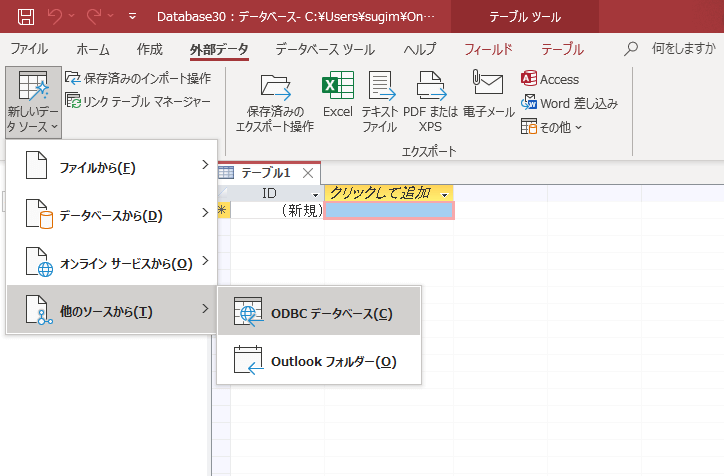 続いて「外部データ」タブから「新しいデータ ソース」→「他のソースから」→「ODBC データベース」を選択します。