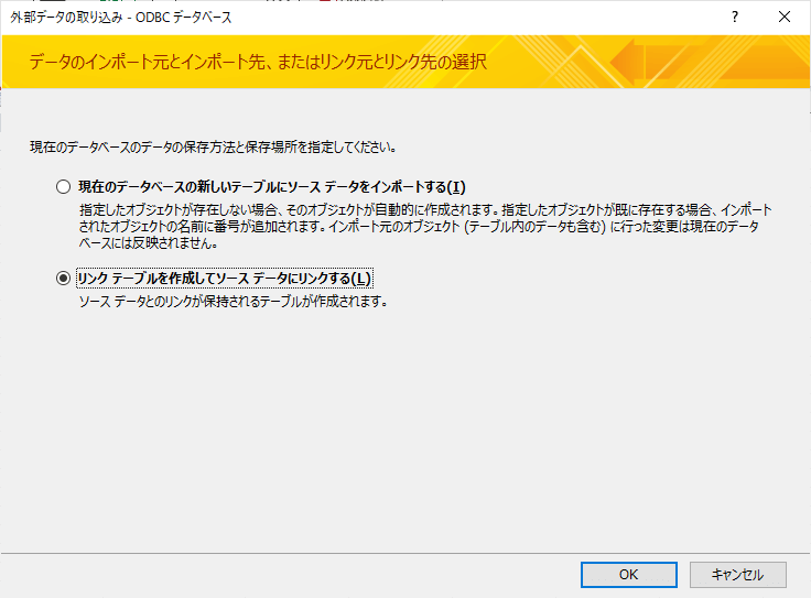ウィザードが表示されるので「リンクテーブルを作成」を選択し、「OK」をクリックします。