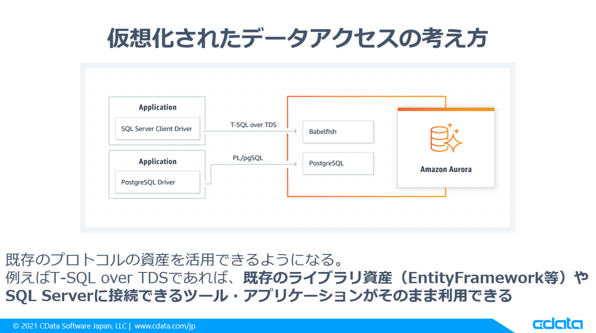 ですが Aurora が PostgreSQL の仕様を T-SQL over TDS で包み込み、擬態することによって、既存のTDS・T-SQLの資産、例えば EntityFramework や ADO.NET 等のライブラリを利用して、アプリケーションのシームレスな置き換えが可能になります。