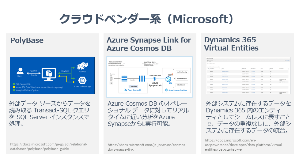 Microsoft Azure 周りのテクノロジーを見渡すとSQL Server の PolyBase 機能はわかりやすいデータ仮想化の一つでしょう。Azure Blob StorageやHadoopのデータをSQL Serverのインターフェースで隠蔽しています。
