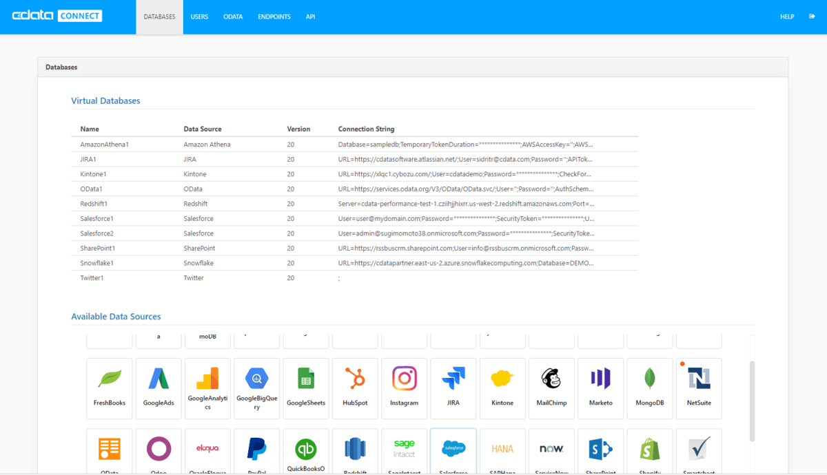 Salesforce、NetSuite、Dynamics、Marketo など多様なSaaS にBI、アナリティクス、iPaaS、NoCode/LowCode 開発プラットフォームからアクセスするための仮想エンドポイントを生成します。