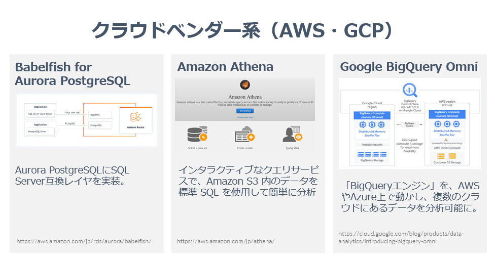前述のAmazon Aurora の TDS・T-SQL機能はまさにその典型的な一例です。