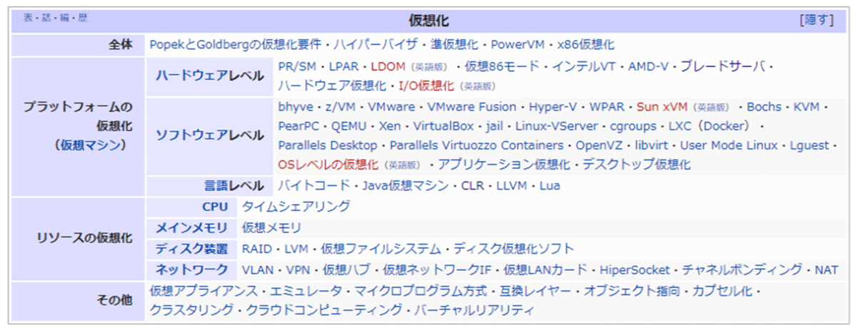 Wikipediaにも掲載されている通りですが、この「仮想化」テクノロジーは実に幅広い要素・アプローチを数多く含んでいます。