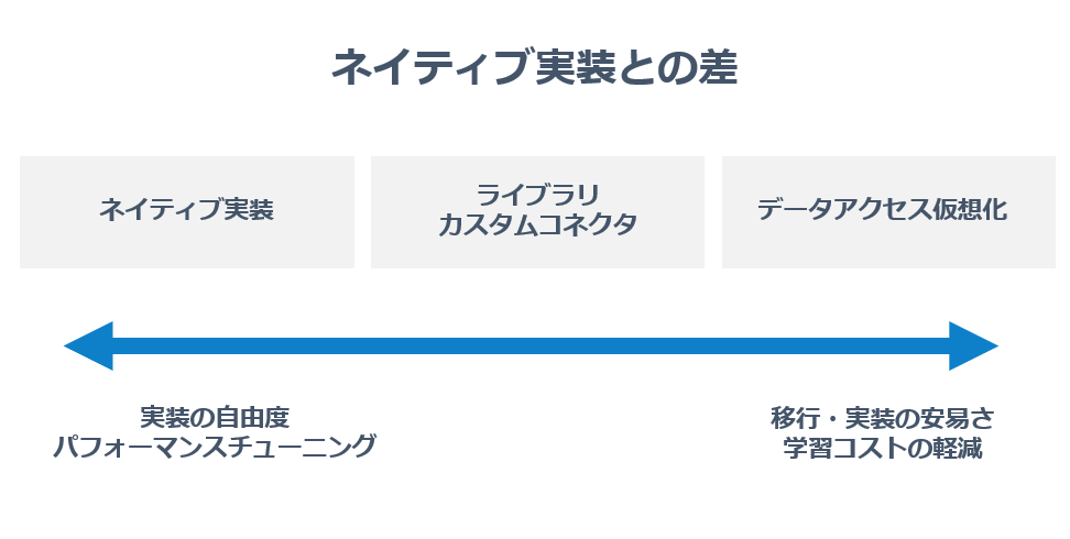 やはりベースになっているネイティブのAPIを直接利用する方法と、データアクセス仮想化とでは、実装の自由度やパフォーマンス・チューニングの幅で差が出てしまいます。