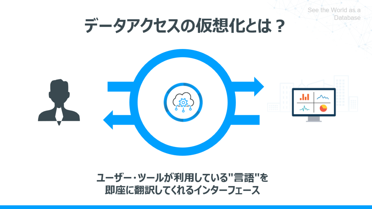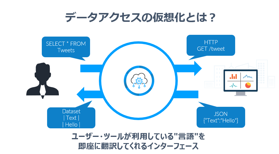 「データアクセス仮想化」とは、「ユーザー・ツールが利用している"言語"を即座に翻訳してくれるインターフェース」であると書きました。