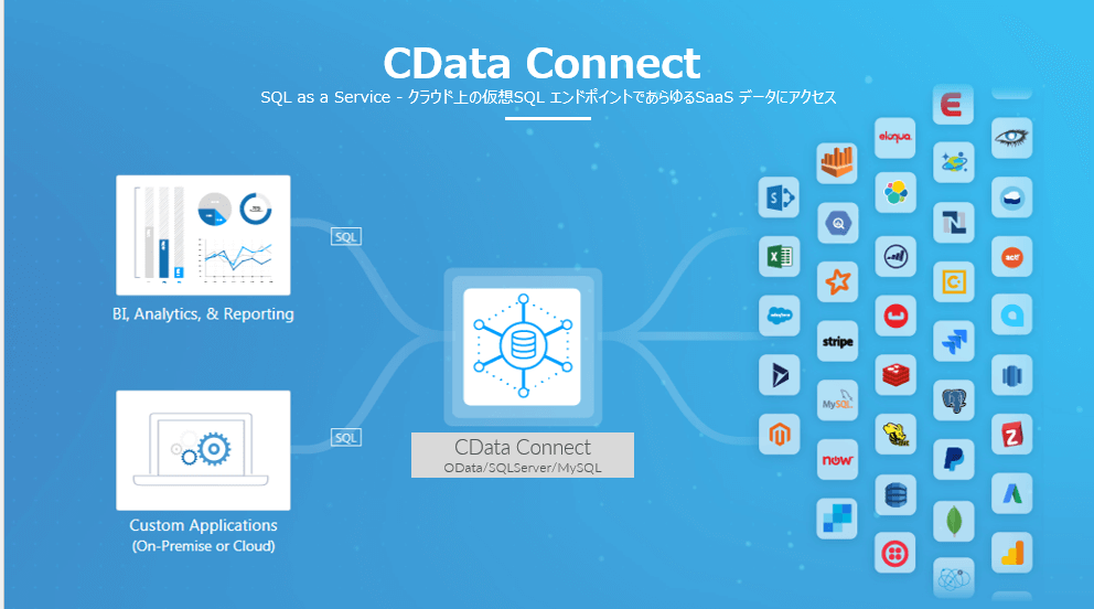 CData で提供している CData Connectは Salesforceや Dynamics 365 等の各種サービスをTDS・MySQL Wire Protocol・ODataの3種類の仮想化しています。