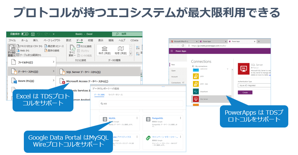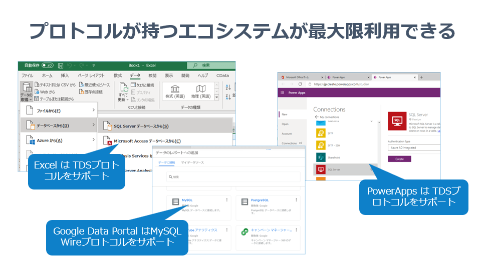 Microsoft のローコード開発ツール PowerAppsでもSQL Serverコネクターがありますが、これも内部的にはTDSで動作しています。